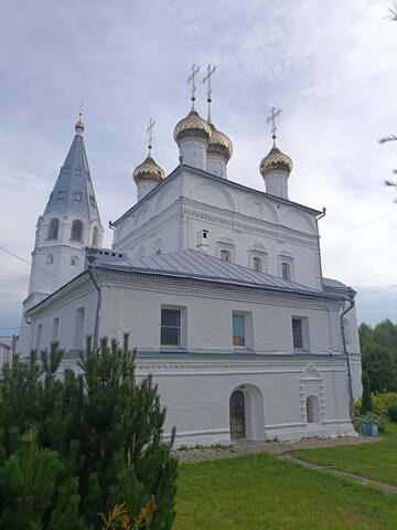 Потом я спустился с огромной высоты по очень крутому спуску в центральную часть города. Там напротив друг друга находятся Благовещенский монастырь и Историко-художественный музей. До открытия музея еще очеь долго, а в монастырь зайти можно. Это женский монастырь, относящийся к муромской епархии и основан в 1641 году. В декабре 1640 года царь Михаил Фёдорович прибыл в Вязниковскую слободу на поклонение чудотворной Казанской иконе Божией Матери, незадолго до этого обретённой. Церковный староста Иван Мухин обратился к царю с челобитной, в которой испрашивал дозволения на устройство монастыря в слободе. Государь с решением долго тянуть не стал и повелел устроить обитель у подножия горы Венец, на берегу речушки Выдерки возле «убогих домов». Сейчас он состоит всего из двух церквей. Надвратная церковь всех святых сейчас на ремонте.