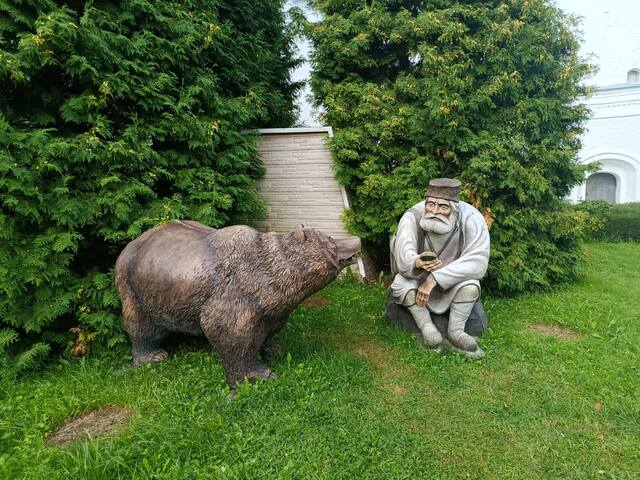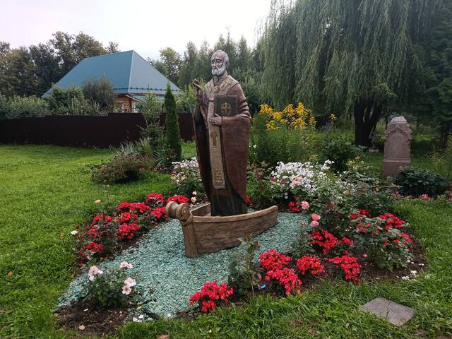 В его дворе выставлены разные интересные фигурки. Что это за священник на лодочке, я не знаю.