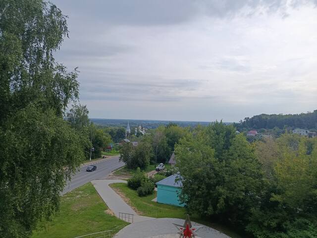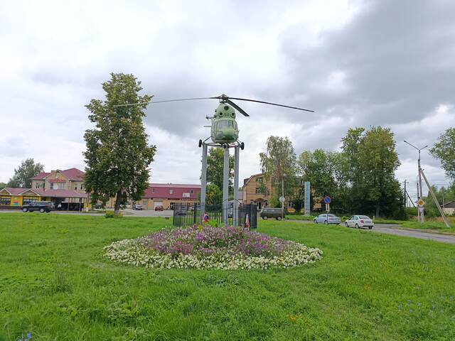 Оставалась еще отмеченной на карте смотровая площадка Венец. Но я то ли поленился на нее заехать, то ли время поджимало. Ведь я вчера смотрел на Клязьму и через пару часов буду смотреть. А зря, с нее виды самые лучшие. На повороте к дороге в Гороховец стоит вертолет МИ-2. Он символизирует Вязниковскую летную школу и ее роль в победе.