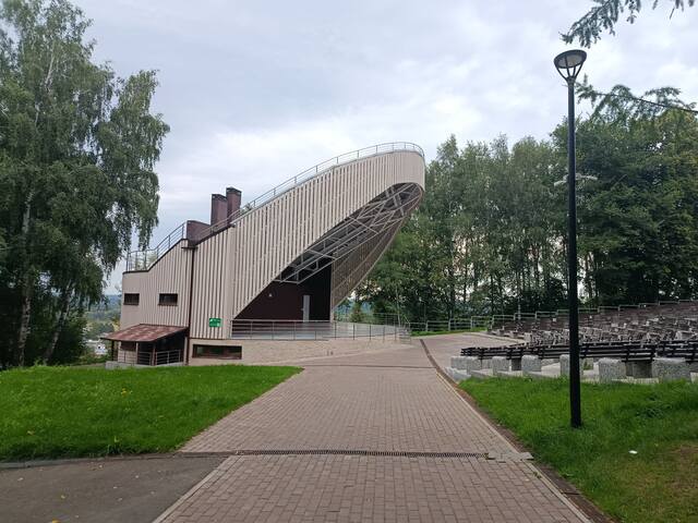 Между тем в парке на карте просматривалась летняя сцена, и я решил все-таки туда вернуться. Я снова поднялся по лестнице, повернул налево и вскоре увидел не только лес. Это сцена, на которой устраивают летние концерты, а наверху еще и смотровая площадка, правда не выше деревьев. Тут вообще полноценный парк с аттракционами.
