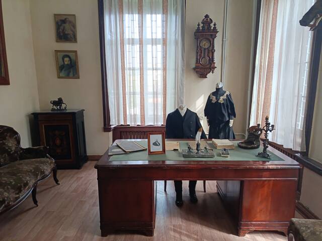 Начал капать дождь, и я поспешил вниз к припаркованному велосипеду. Сначала я зашел в магазин, так как хотелось пить и перекусить, и тут дождь разошелся. Однако, это был самый край тучи, основная масса которой шла по Ивановской области. Уже через 10 минут все прекратилось, а музей должен был открыться. Ранее этот дом принадлежал купцу, фабриканту и городскому главе Елизарову. Первое, что там можно увидеть, это его рабочий кабинет.