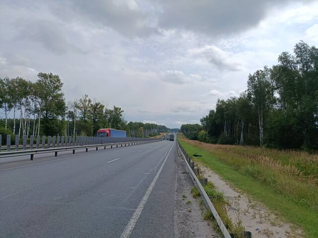 Но эта широта исключение, тут все-таки крупная развязка. Класть асфальт с краю наши дорожники не любят. В моем распоряжении были 20 см правее белой полоски, справа отбойник, а слева обгоняющие друг друга большегрузы. Ну ничего, мне этого хватает. Местность еще такая веселая. Где-то скорость была 14, а где-то 56 км/ч, по ровным уасткам я ехал 30, и 40 км пути я преодолел за 1,5 часа.