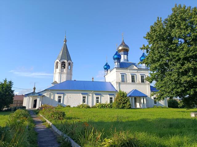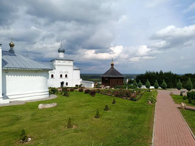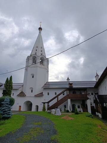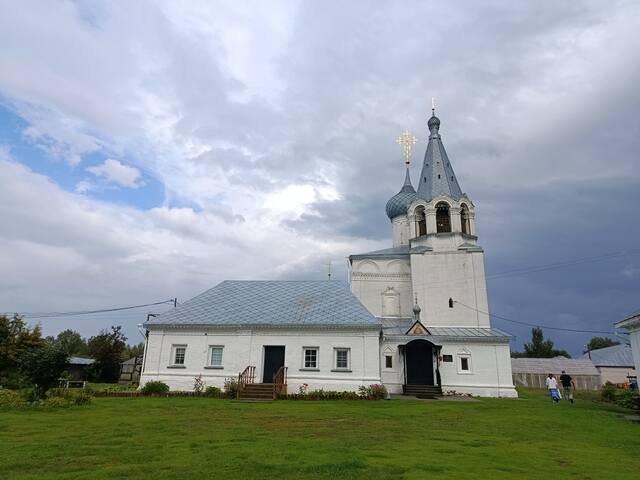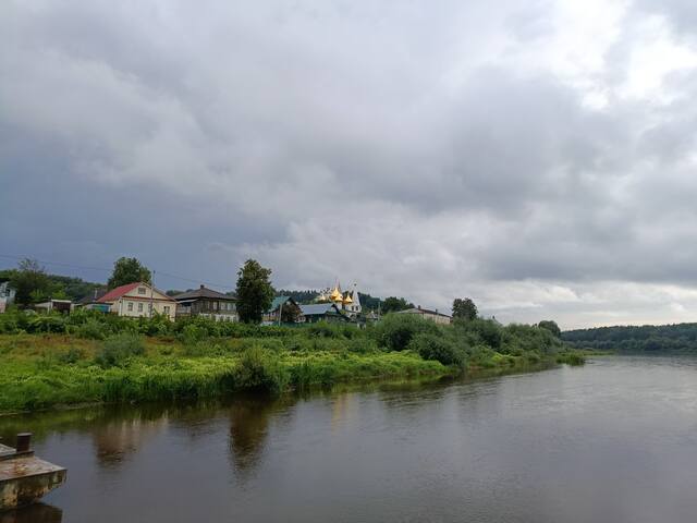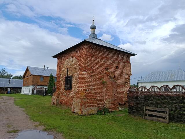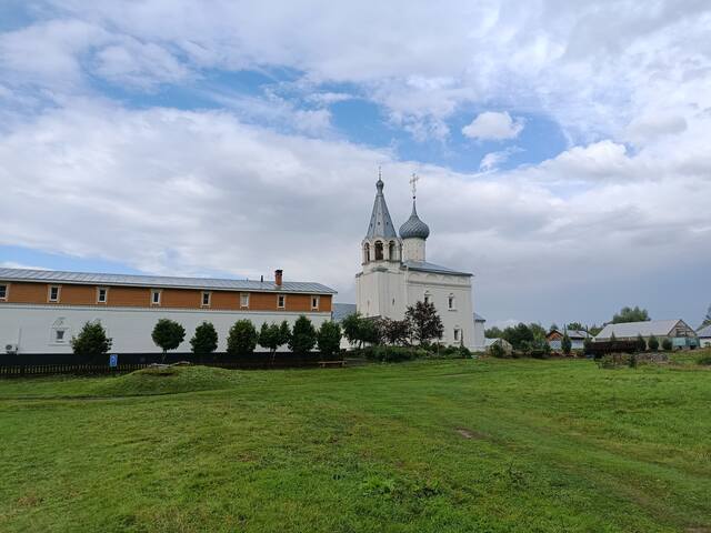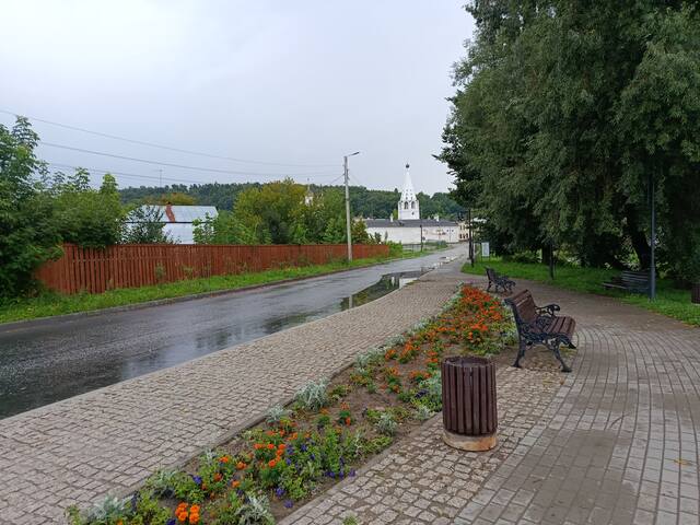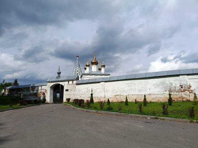 Но есть еще и третий монастырь - за рекой. Для проезда к нему через Клязьму перекинут понтонный мост. После моста я проехал по промоченной дождем бетонной дороге. Это Знаменский женский монастырь. Там почти нет народа. В центре стоит Знаменский храм, вокруг две кельи и ворота в плетеной изгороди, еще краснокирпичная башня-часовня.