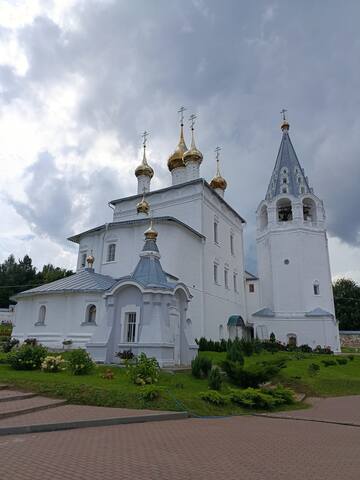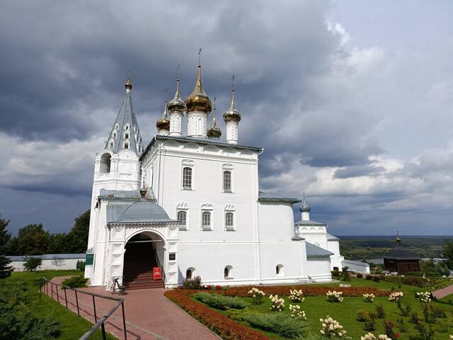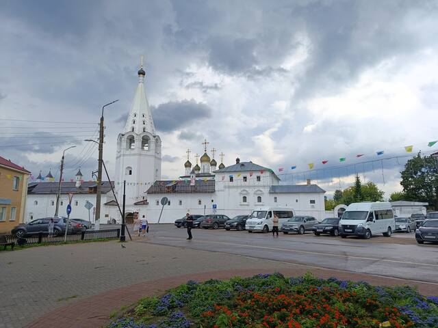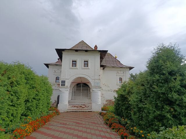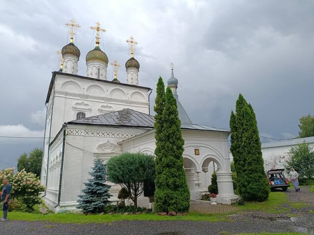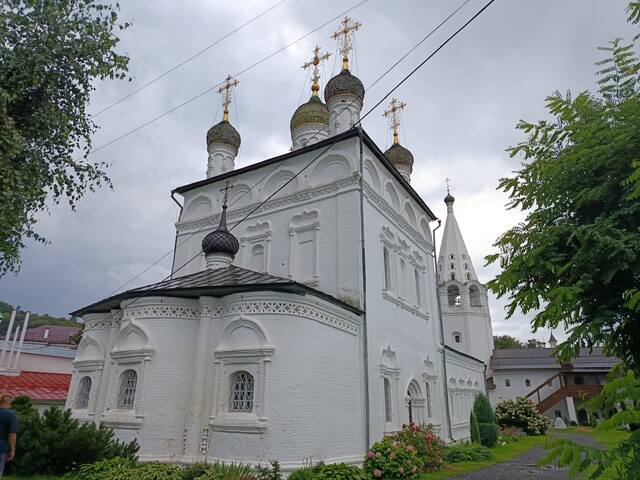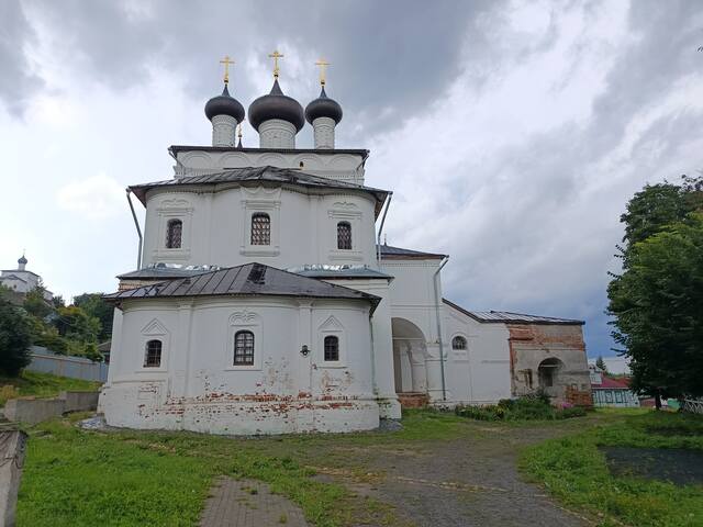 Это уже окранина Гороховца, и скоро начался узкий и крутой спуск в центр города. На половине этого спуска стоит Троице-Никольский монастырь, основанный в 17 веке.
