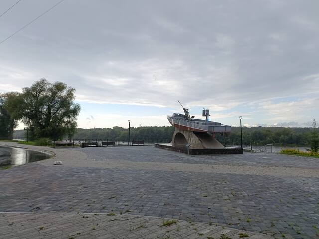В одну сторону набережная заканчивается мотоботом. Такие строили в годы войны на местном судостроительном заводе.