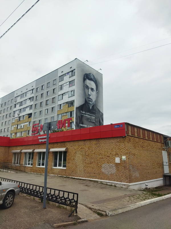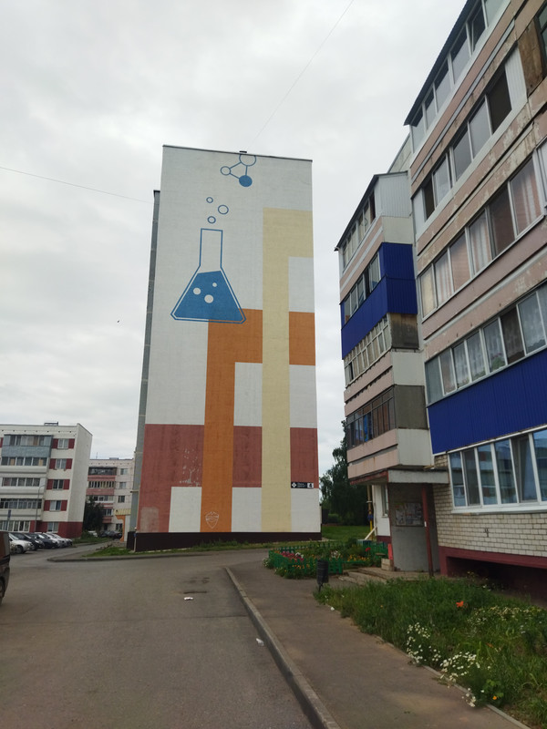 Доехав до центра, я перешел железную дорогу и оказался на улице Химиков. Тут на доме с муралом изображен Борис Пастернак и его высказывание "Человек рождается жить, а не готовиться к жизни". Ну а на другом доме рисунок говорит о том, что это город химиков.
