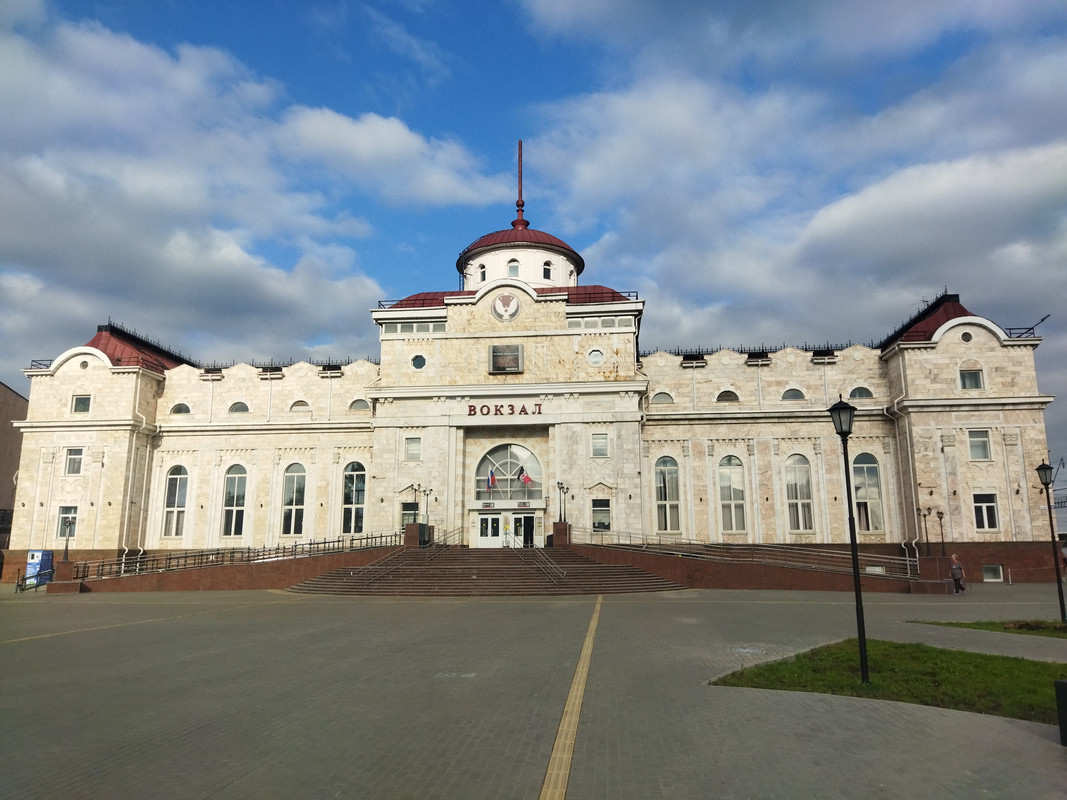 Он ехал примерно по тому маршруту, по которому у меня проложен трек. Пару раз его путь пересекала отмеченная автомобильная дорога, и я видел, что она почти без машин к тому же ровная, асфальтированная, это примерно треть маршрута до Ижевска. Интересно тут проведена административная граница. Вокруг територия Мордовии, и на сверо-восток к Ижевску идет длинный аппендикс из татарских деревень, и как раз по нему идет железная дорога. И находятся этот аппендикс и окружающая его Удмуртия они в разных часовых поясах. Мой телефон несколько раз показывал то московское, то удмуртское время. В Удмуртии время на час вперед. Татары же живут по московскому времени. Приехал я в Ижевск в 6 часам и поужинал напротив вокзала в Додо Пицце. Вот здание вокзала.