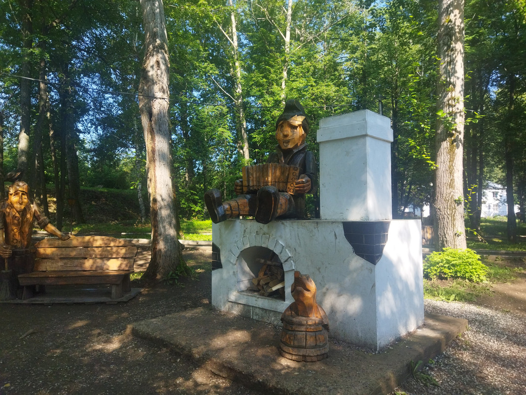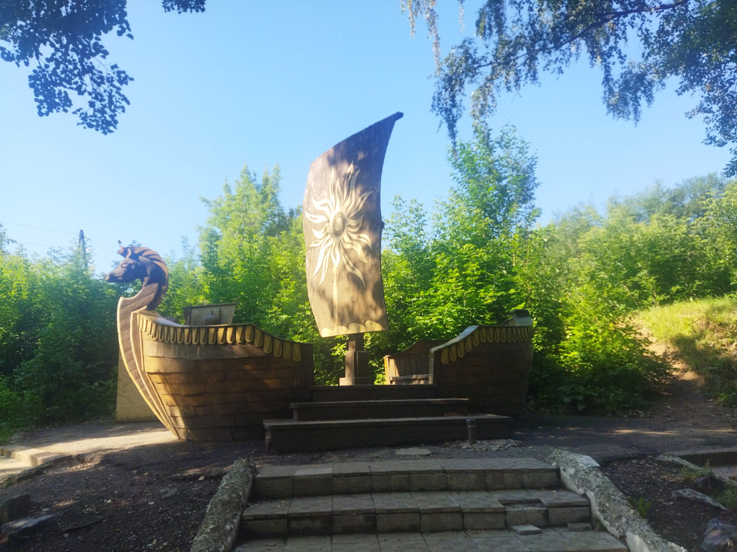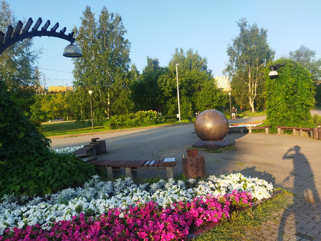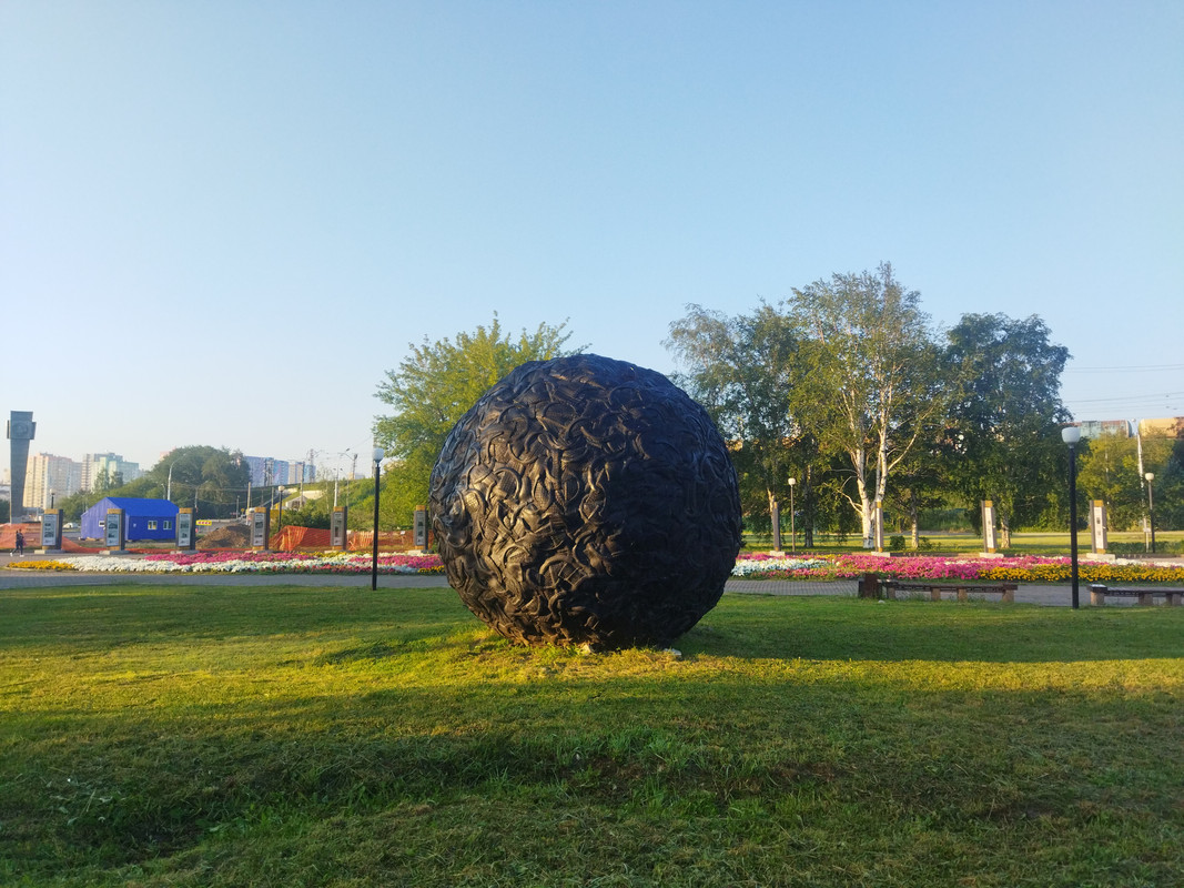 Ехать до нового вокзала 3 км, а на подъезде к нему я увидел сквер, в который захотелось заехать. Что это за шар из порезанных автопокрышек?
