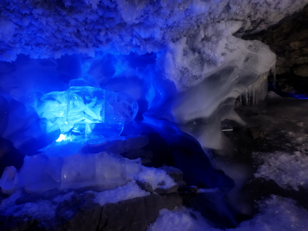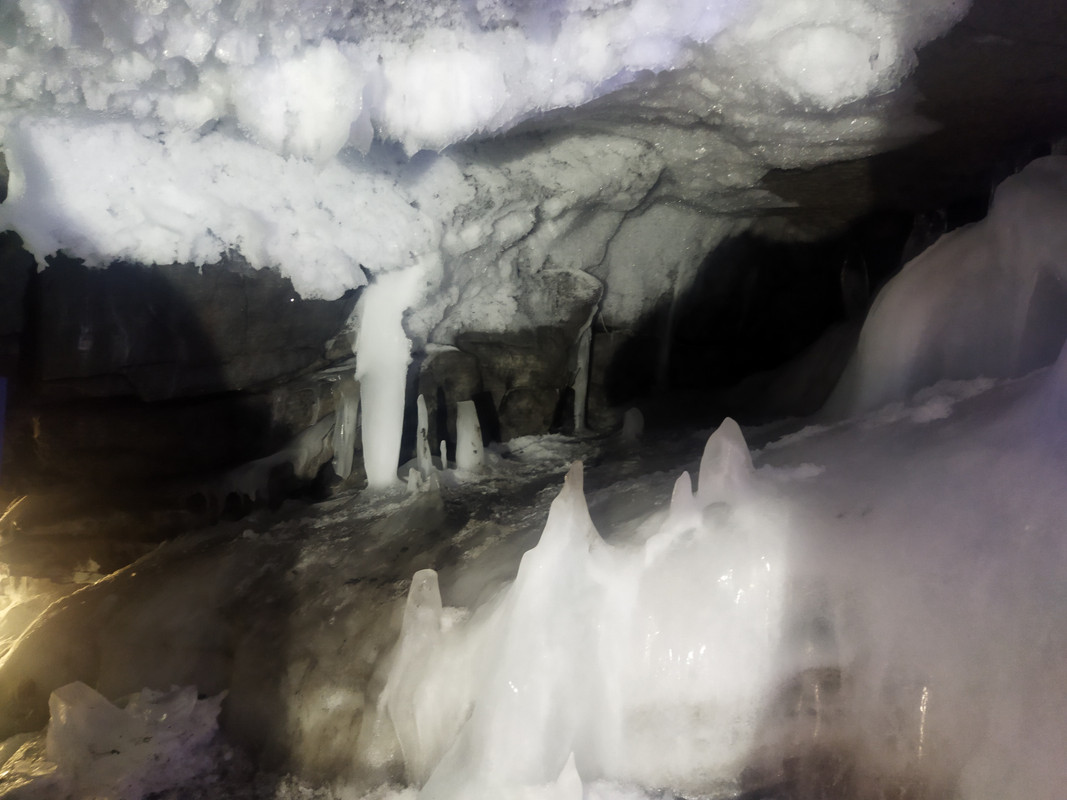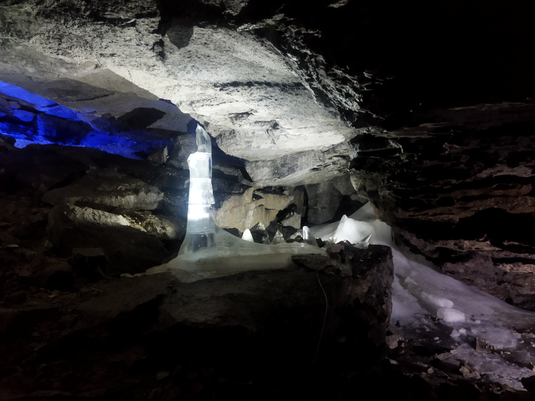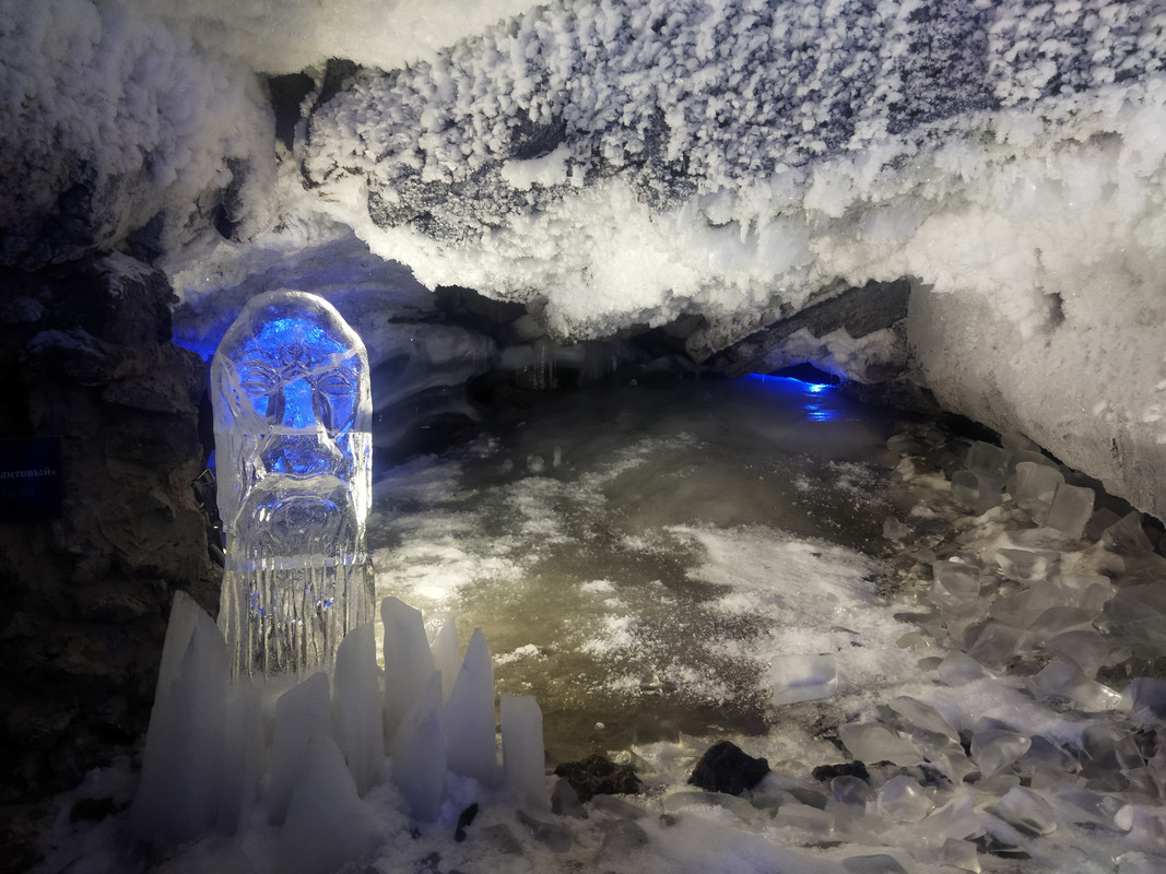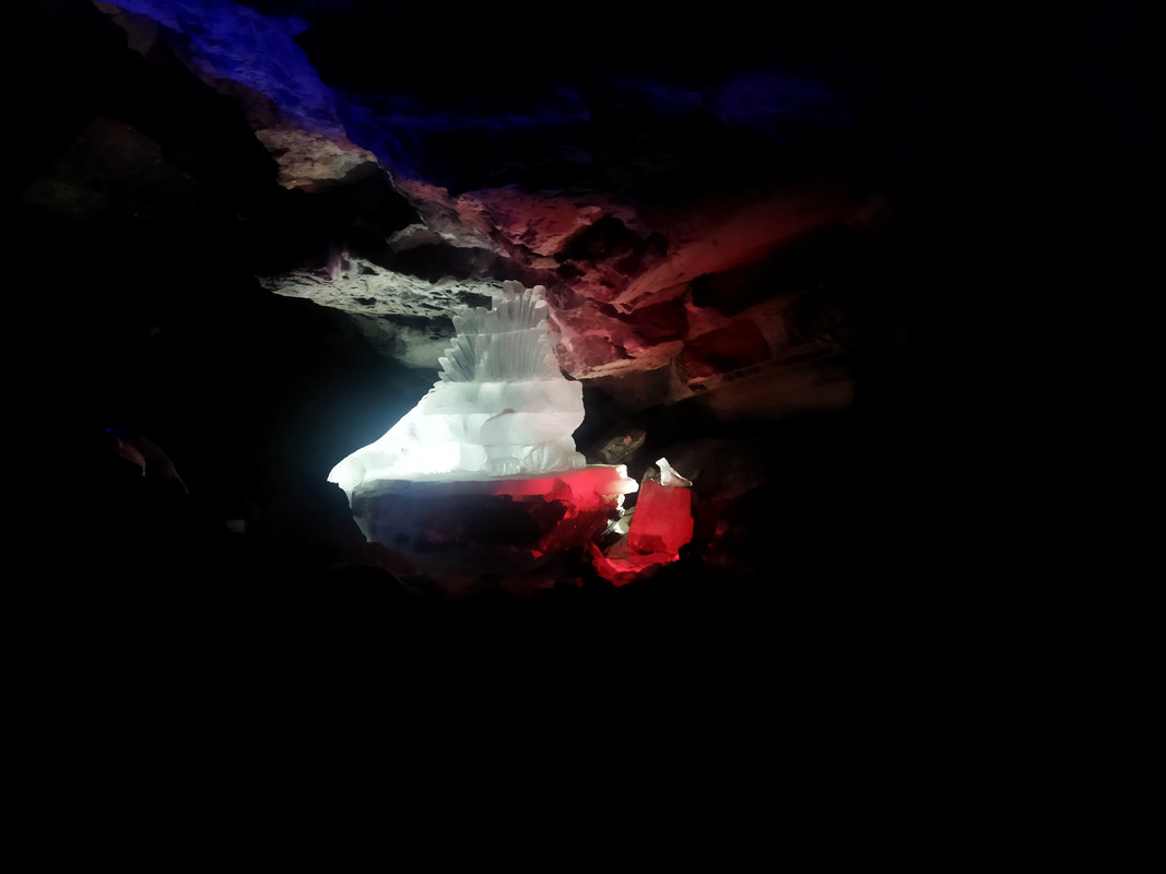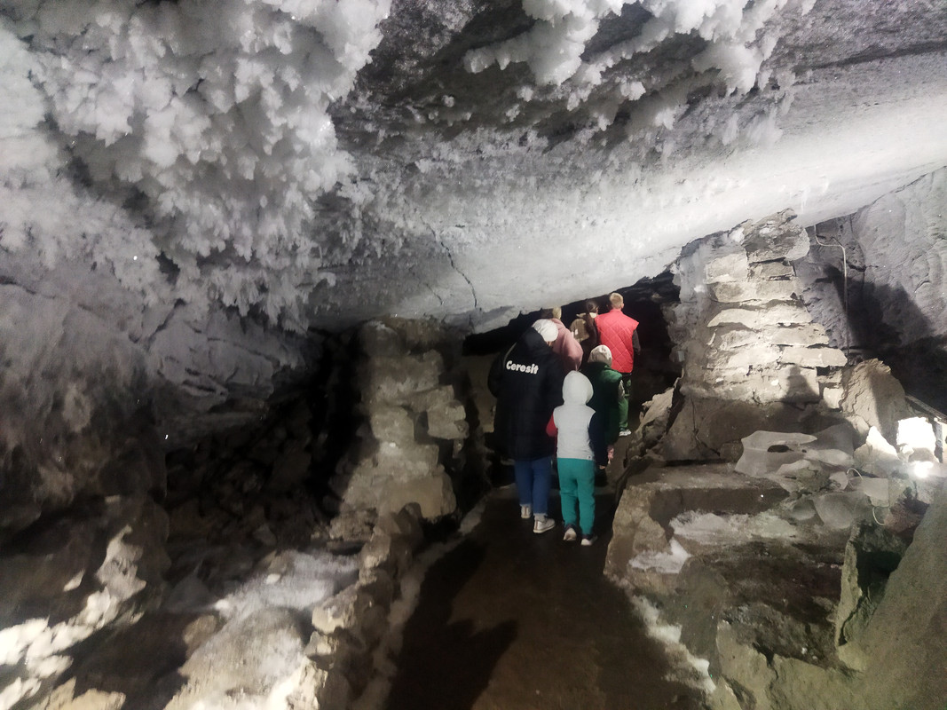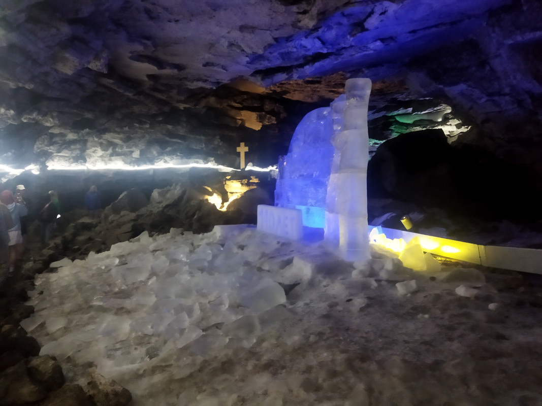 Перед началом эескурсии меня просили взять напрокат куртку, иначе я не выдержу и 10 минут. А экскурсия длится полтора часа. В куртке или нет, но я все равно замерз. Там около нуля, и одеваться надо как зимой. Зимой наоборот там греются, так как вокруг двадцатиградусный мороз. В пещере много сосулек и льдинок, все это сверкает при свете ламп, а люди еще и добавили ледяных скульптур.