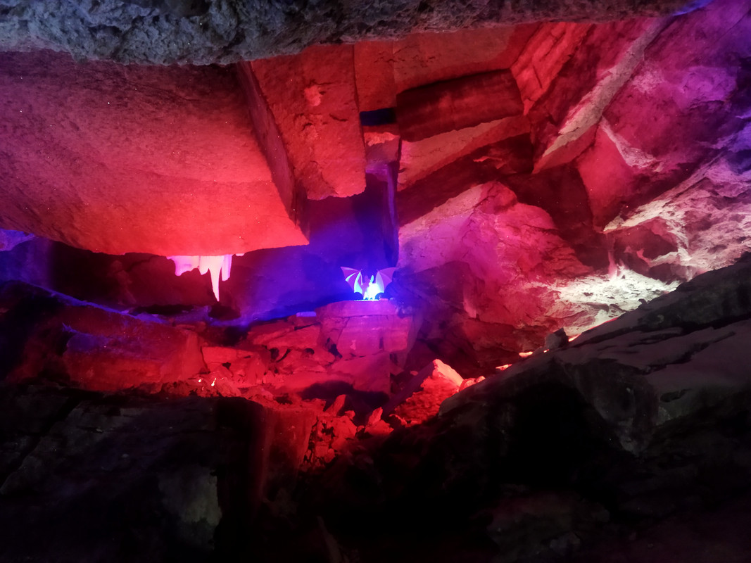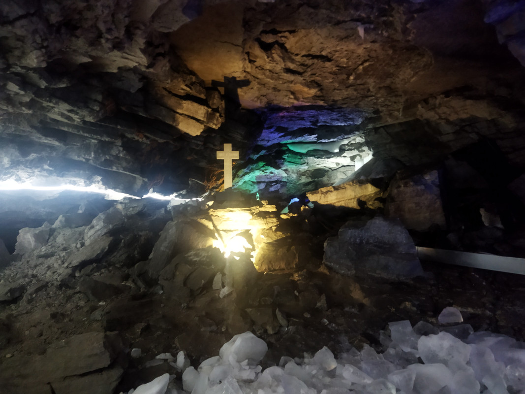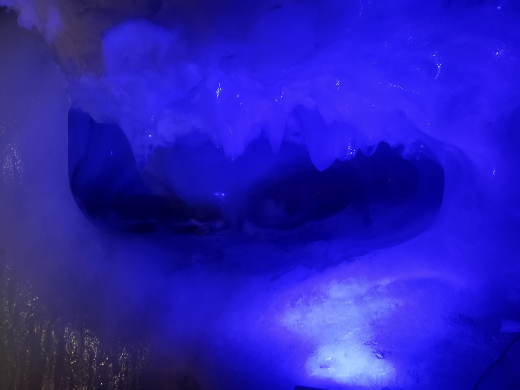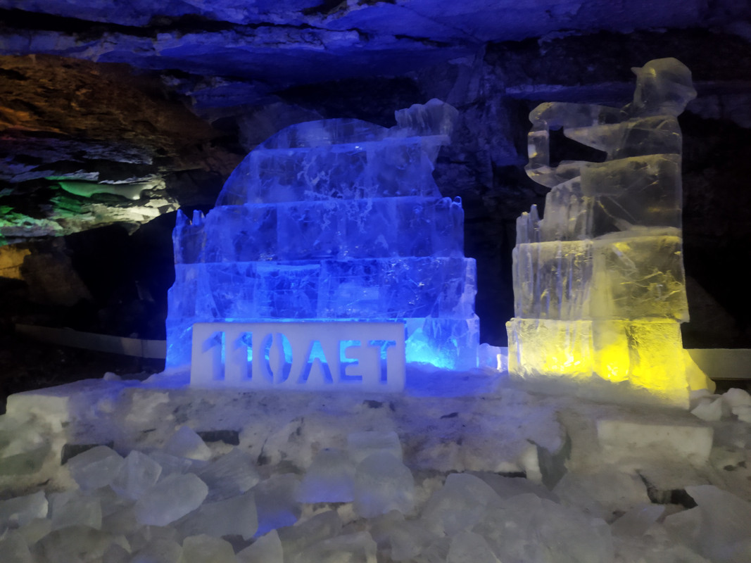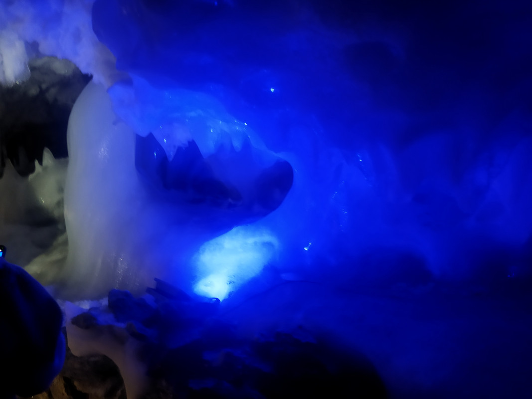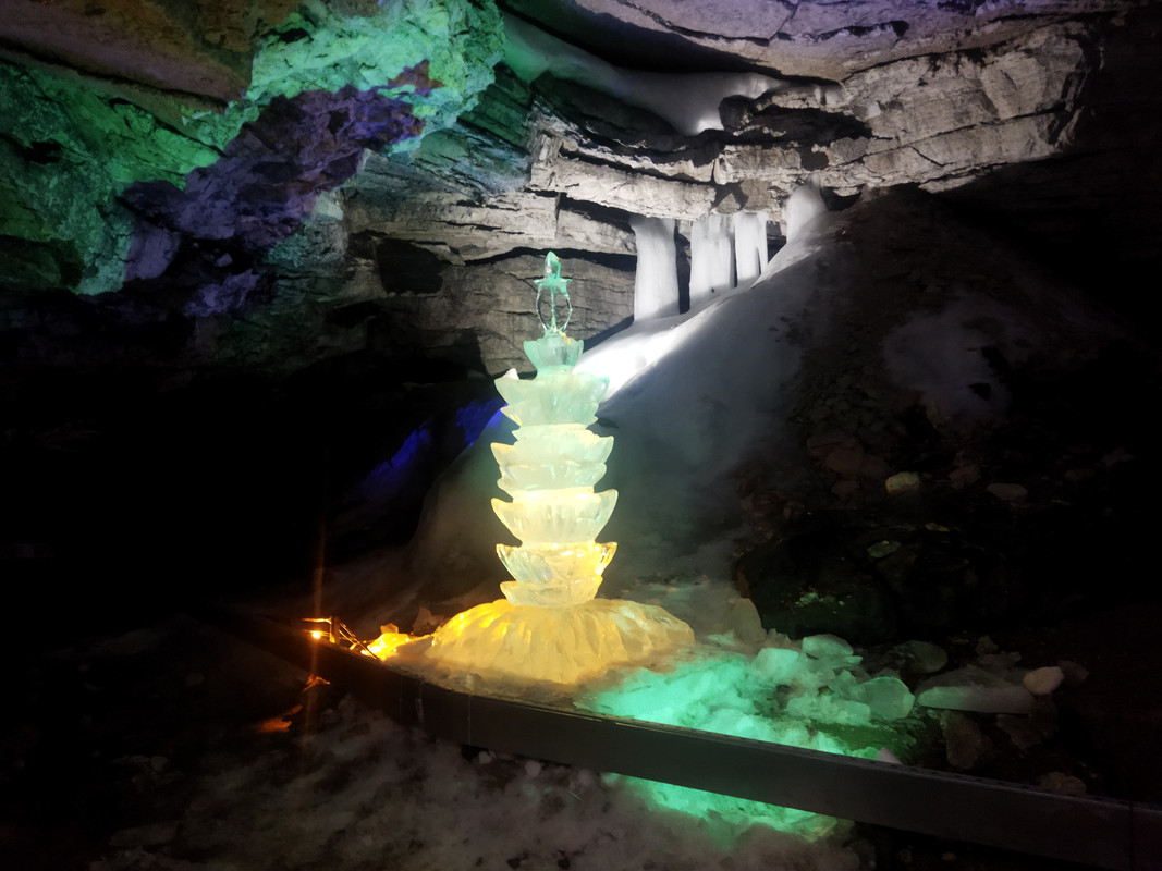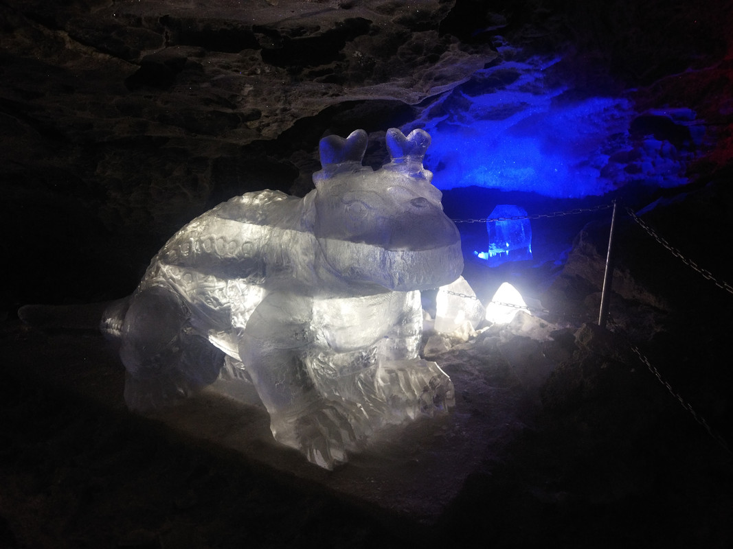 Перед началом эескурсии меня просили взять напрокат куртку, иначе я не выдержу и 10 минут. А экскурсия длится полтора часа. В куртке или нет, но я все равно замерз. Там около нуля, и одеваться надо как зимой. Зимой наоборот там греются, так как вокруг двадцатиградусный мороз. В пещере много сосулек и льдинок, все это сверкает при свете ламп, а люди еще и добавили ледяных скульптур.