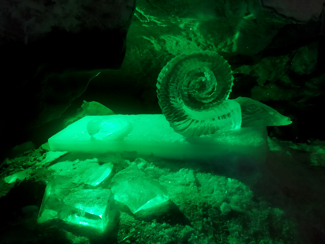А стоит их правильно подсветить, как все приобретает какой-то таинственный цвет. Ледяных аммонитов конечно не бывает, его сделал скульптор.