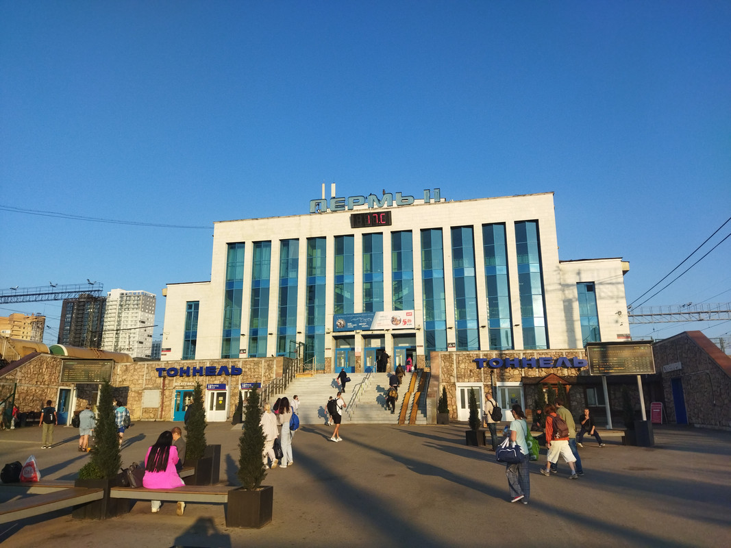 Она построена позже исторического и более красивого вокзала в 1910 году со строительством Транссиба, и с нее отправляется больше поездов. Справа Горнозаводское направление, поезда идут на северо-восток в Горнозаводск, Североуральск и Нижний Тагил. Или окольным путеми в Екатеринбург. И останавливаются они также на станции Пермь-1. Слева же направление называется основное, там поезда идут на юго-восток, в Кунгур, Екатеринбург напрямую и дальше через всю Сибирь вплоть до Дальнего Востока. За вокзалом эти пути сходятся, поезда идут через мост и далее в сторону Москвы.