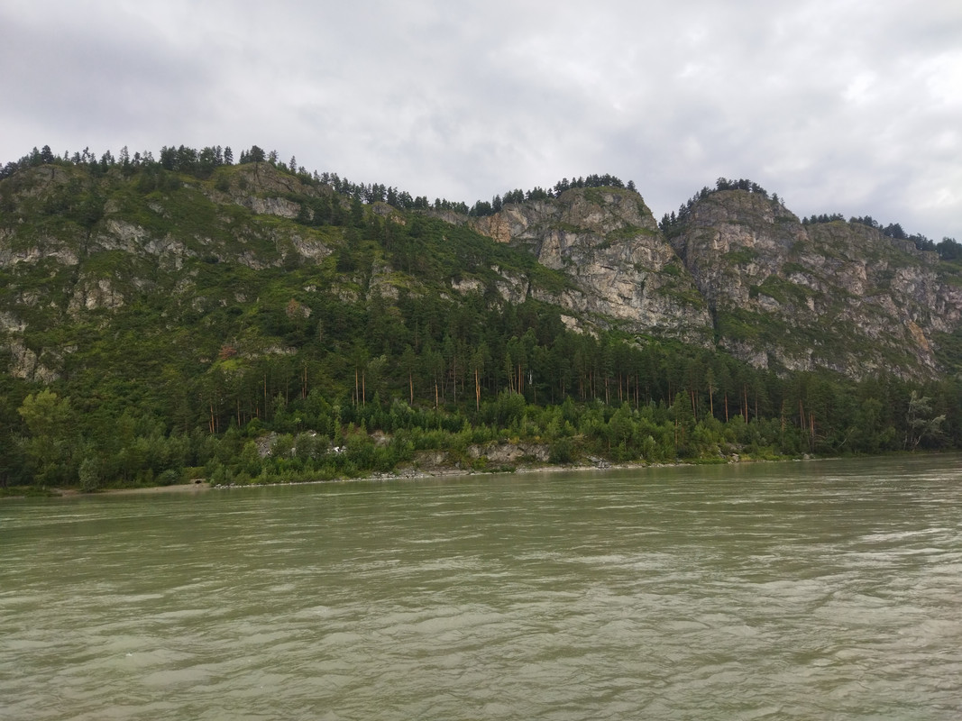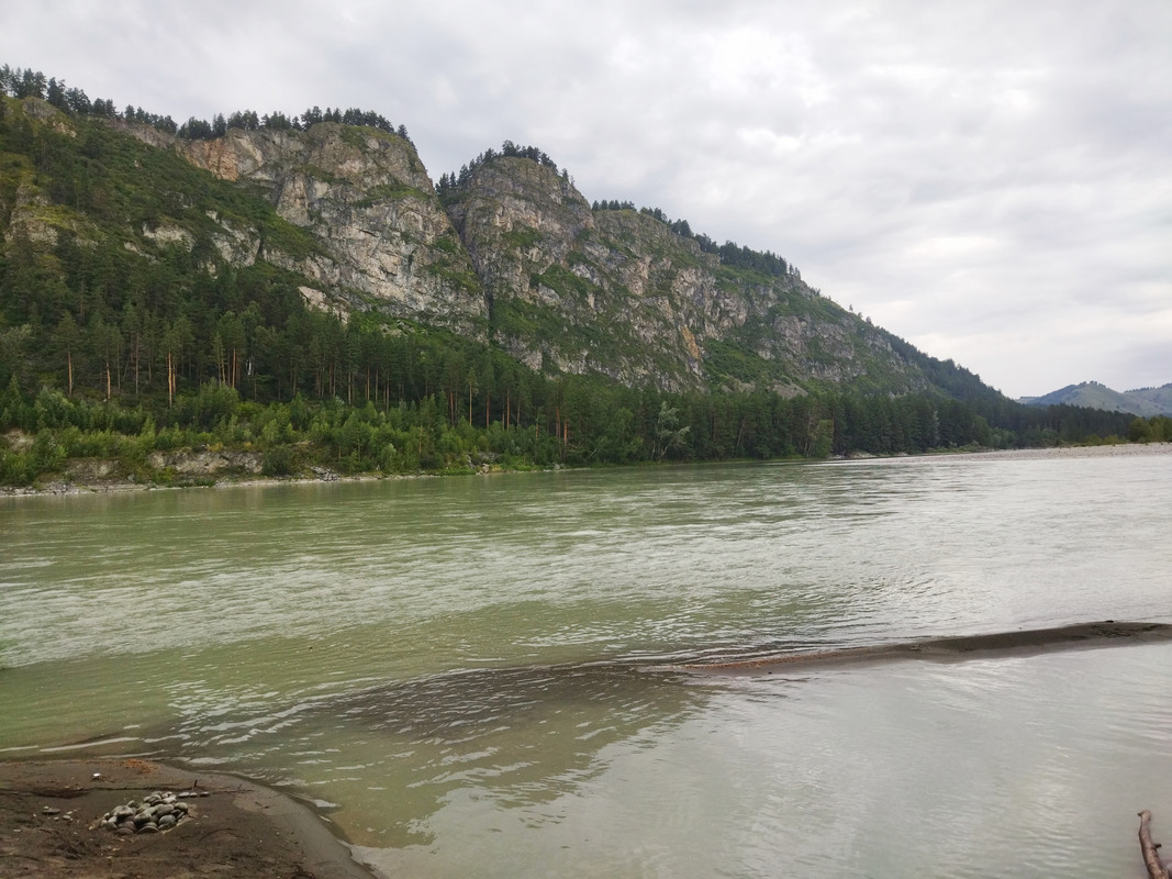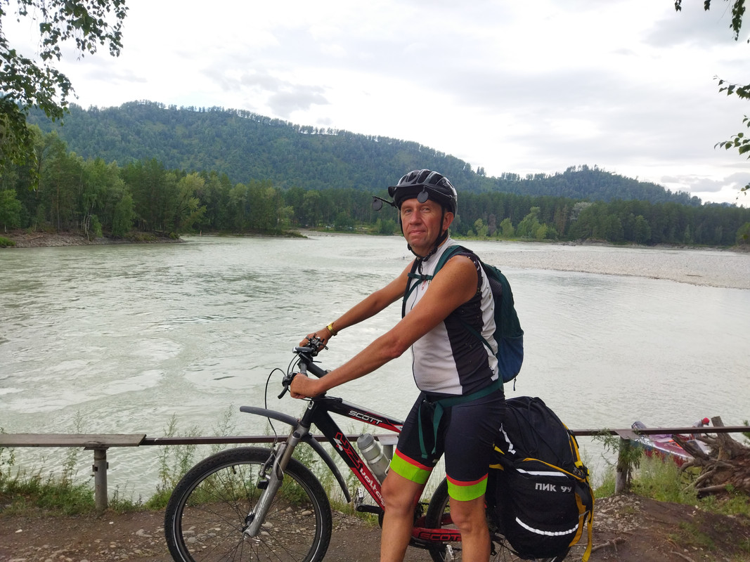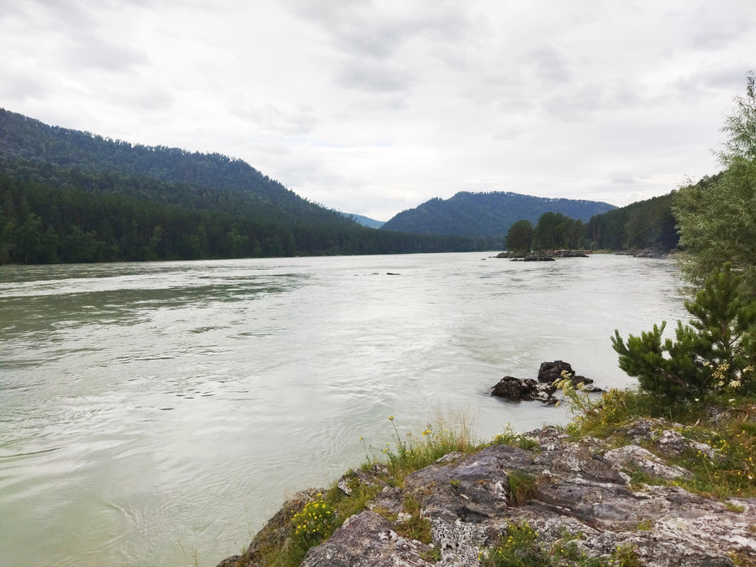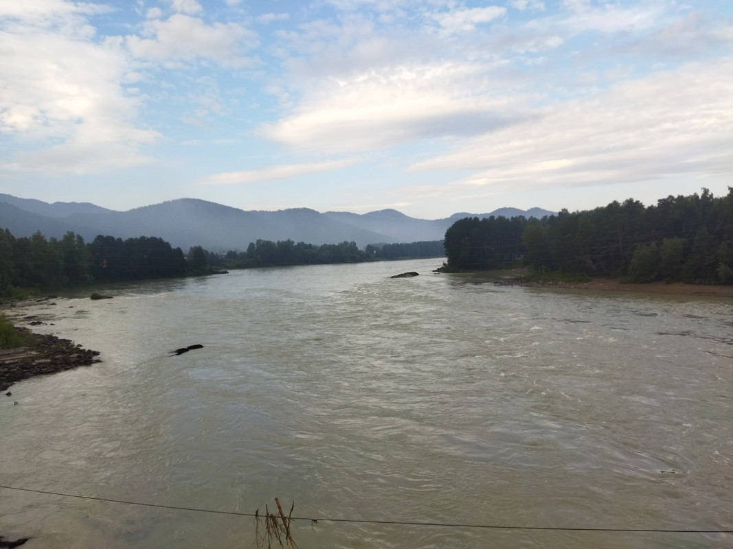 Но не стал я долго медитировать и смотреть на эту красоту, ибо для велотуриста движение - это жизнь, а остановка - это смерть. Я полез вниз, надо было ехать в Манжерок. Я отыскал свой велосипед, заменил промокшие носки и пересек Катунь по автомобильному мосту. На подъезде к Манжероку дорогу снова подошла очень близко к реке, и я сделал несколько снимков.