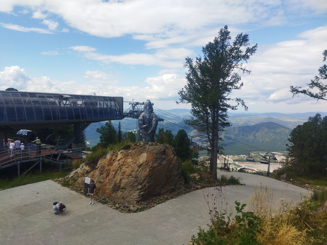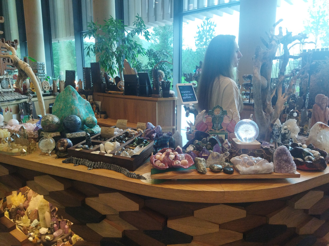 На этой площади находится вход на канатную дорогу, а в здании его окружающем небольшой отель, кафешки, многочисленные сувенирные лавки и прокат велосипедов. Для начала я зашел поесть. Цены выше чем в Москве. На Алтае много где продают местные минералы. Алтайские горы богаты такими вещами.