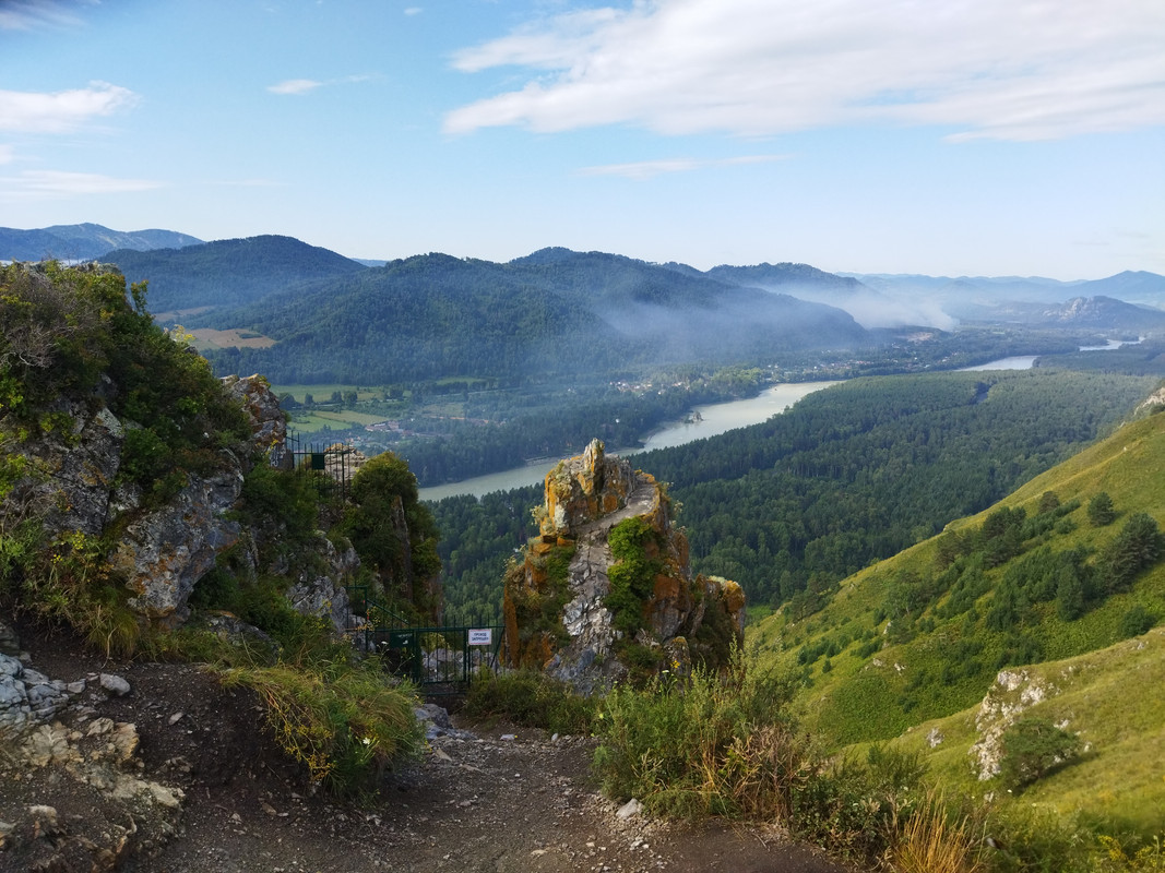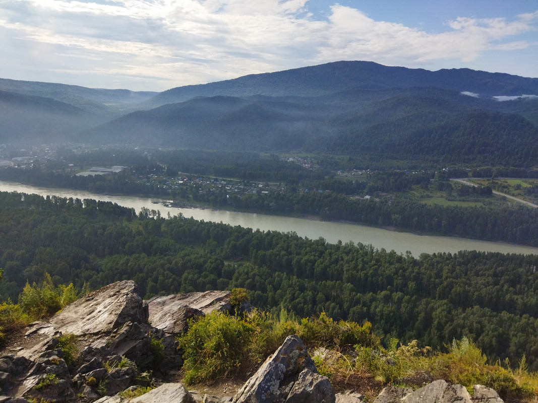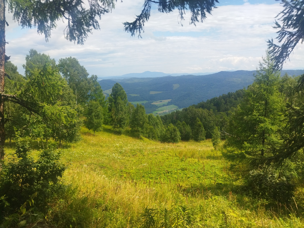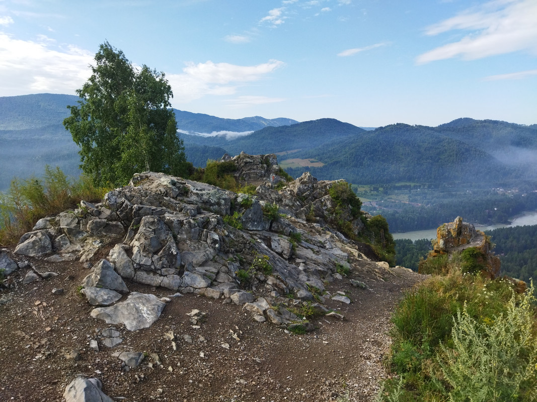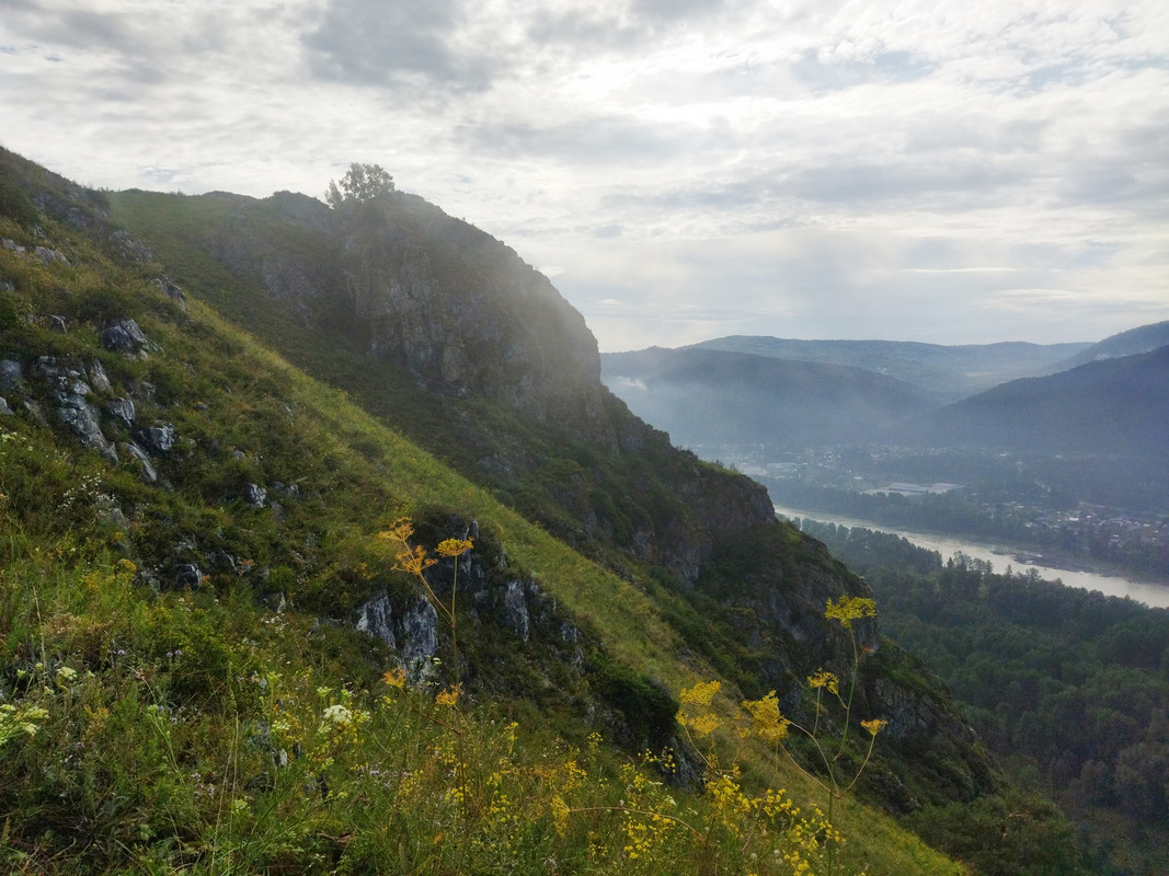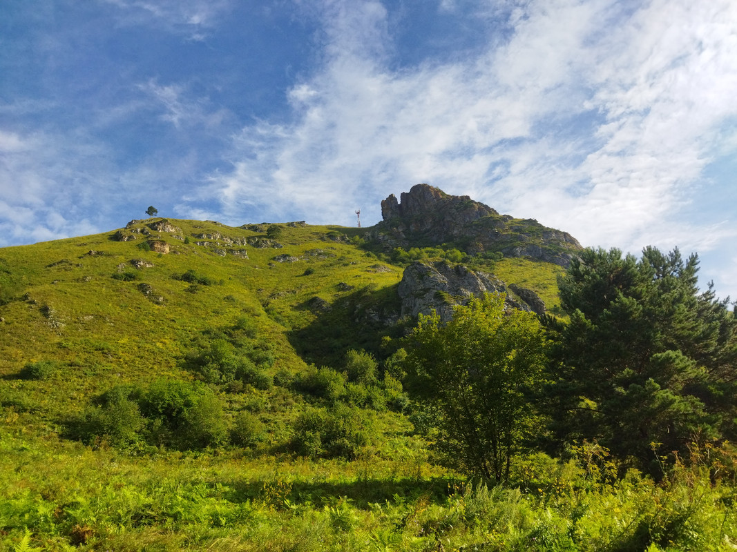 На фотографии гора выглядит не такой уж большой и не такой уж крутой, но в реальности все гораздо сложнее, да еще и вся растительность сырая. Тропа очень даже крутая и местами с курумником. Тем не менее альпинизм такая штука, что пока есть градиент, тянет лезть и лезть, пока он не кончится. И я долез до самого верха, мог увидеть во всей красе долину Катуни и каменистые зубцы на вершине горы.