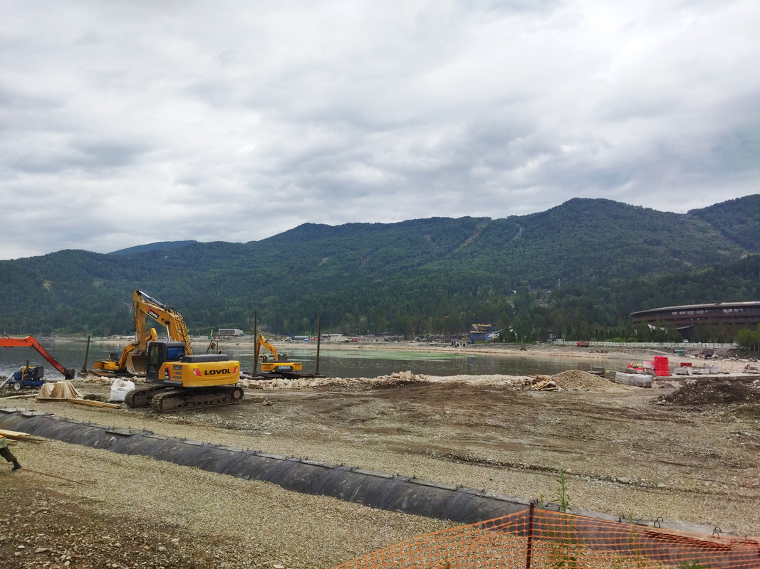 Проехав этот поселок, я свернул к курорту и подъехал к Манжерокскому озеру. Его все еще обустраивают на деньги Сбербанка. К нему даже не подойдешь.