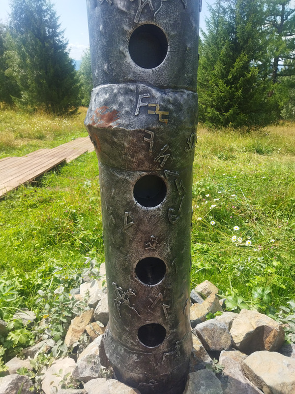 Символы разные и непонятные. Одни похожи на предметы реального мира, другие на какие-то символы. Иду дальше, схожу с деревянного настила на простую тропу. Дальше ничго особенного, несколько горных пейзажей.