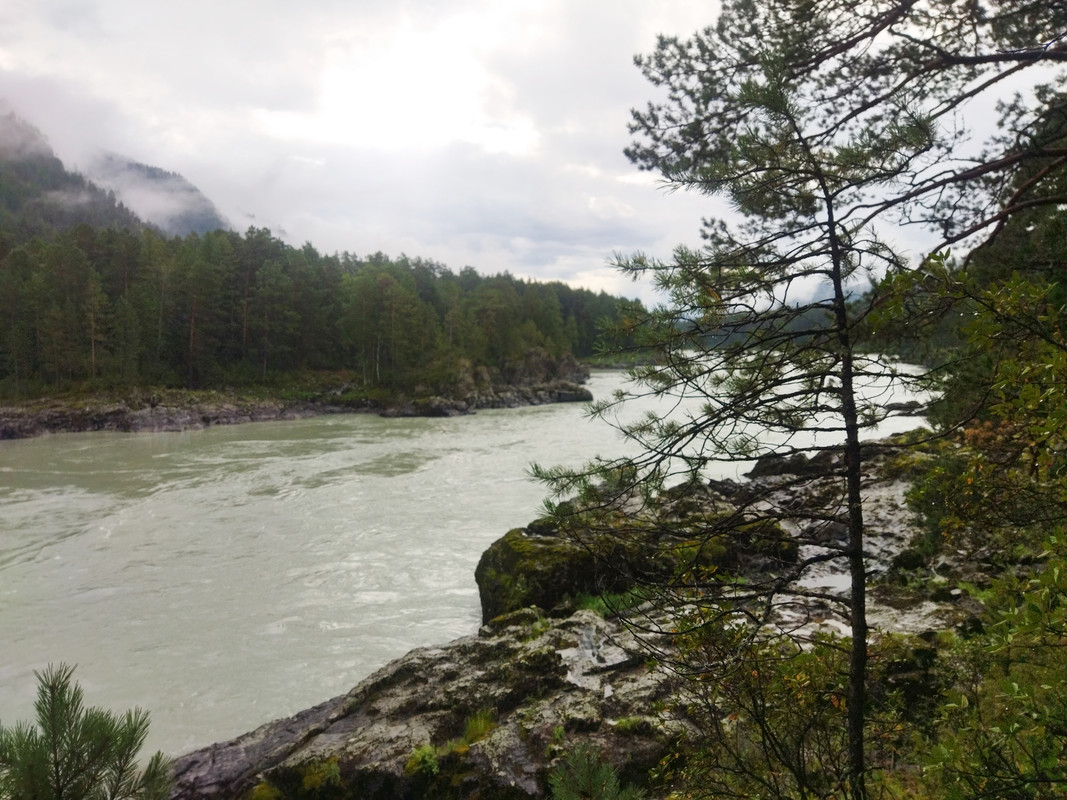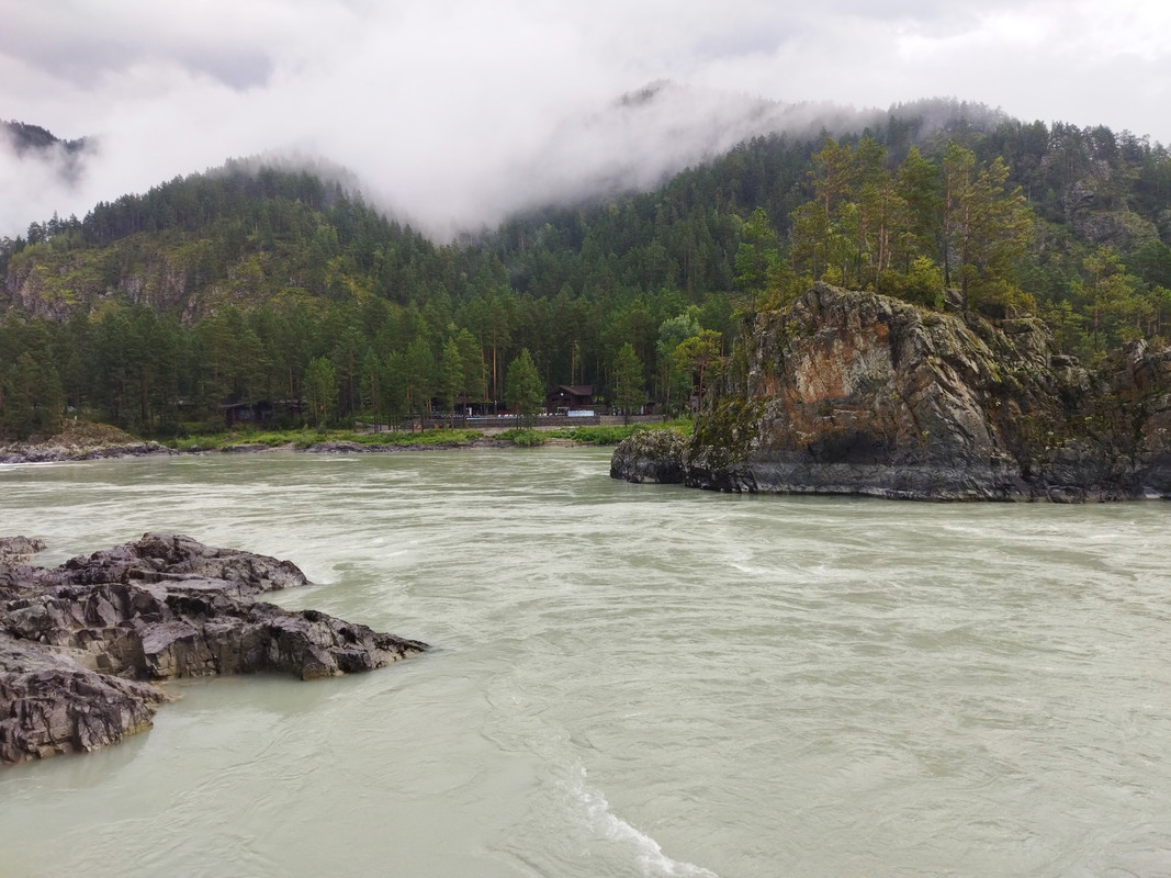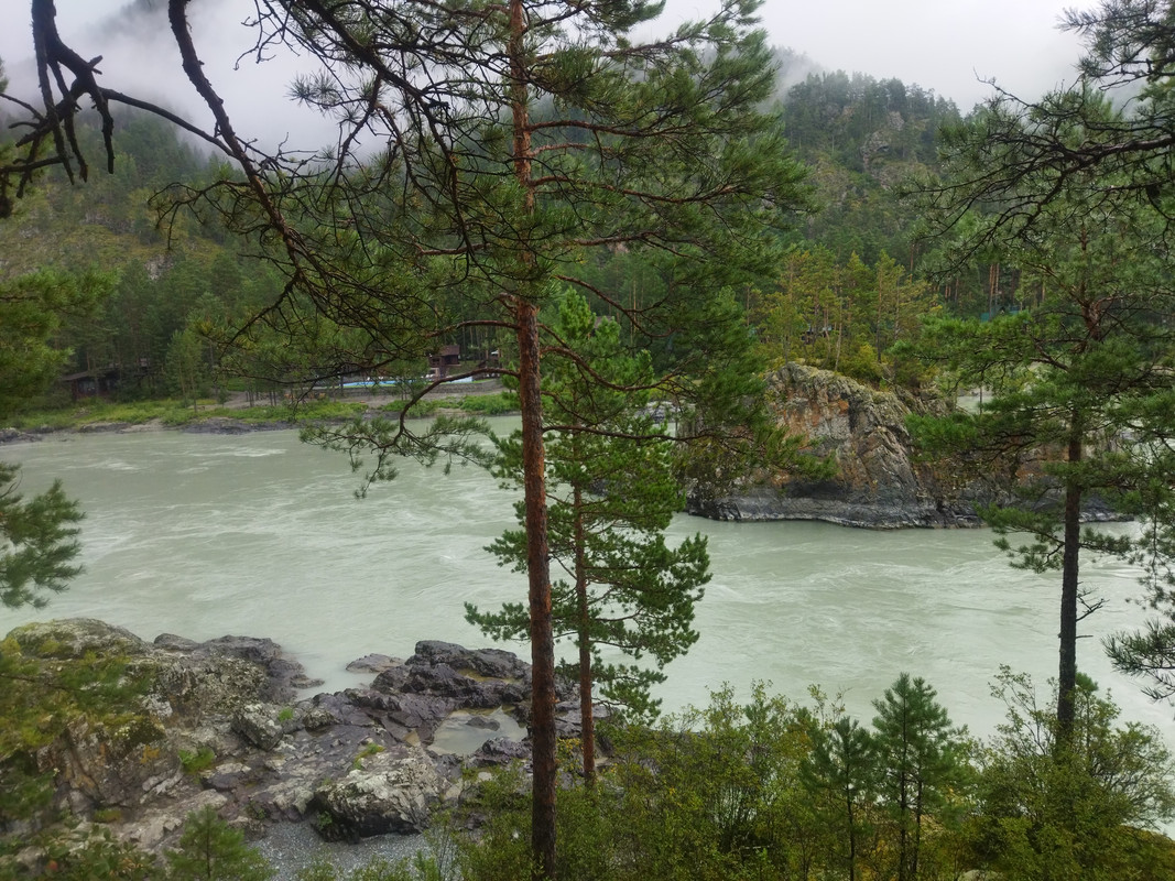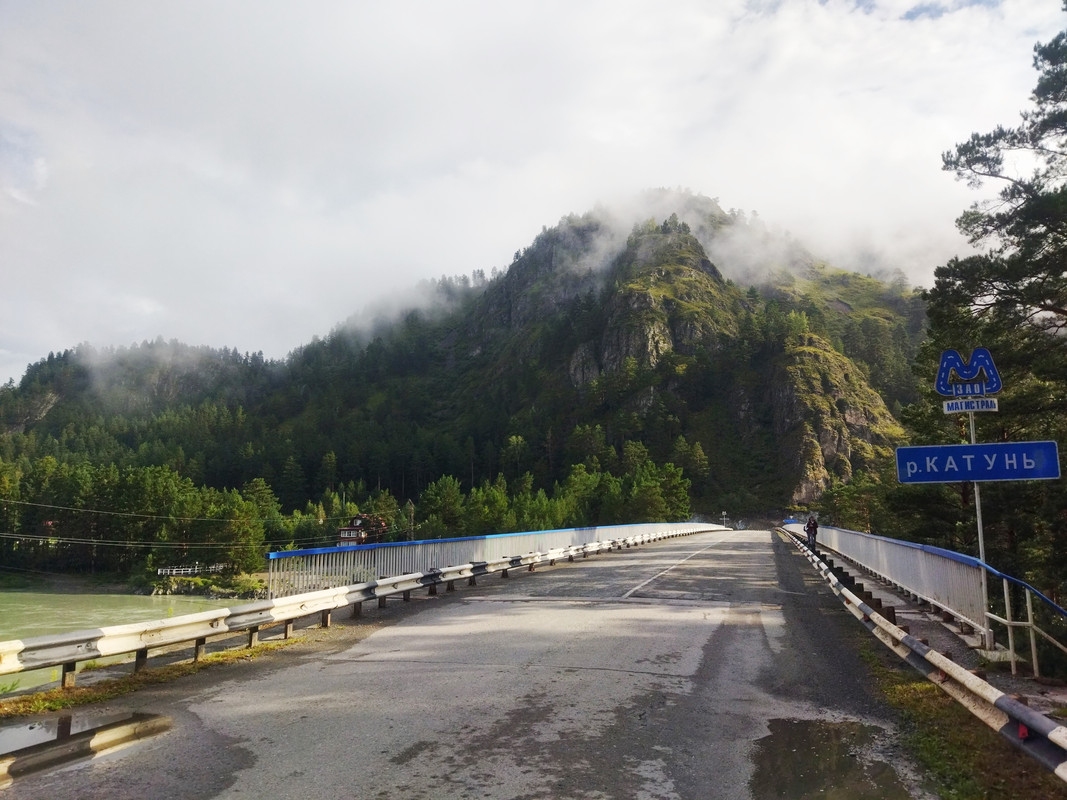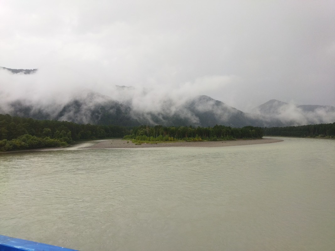 Перед Усть-Семой пошел уже серьезный дождь, и я вынужден был закутаться и зачехлиться. Потом я в последний раз пересек реку Катунь и поехал по тому берегу к Катуньским ваннам. Все вокруг в дожде и тумане.