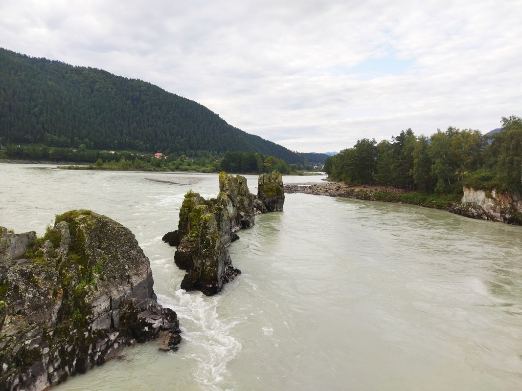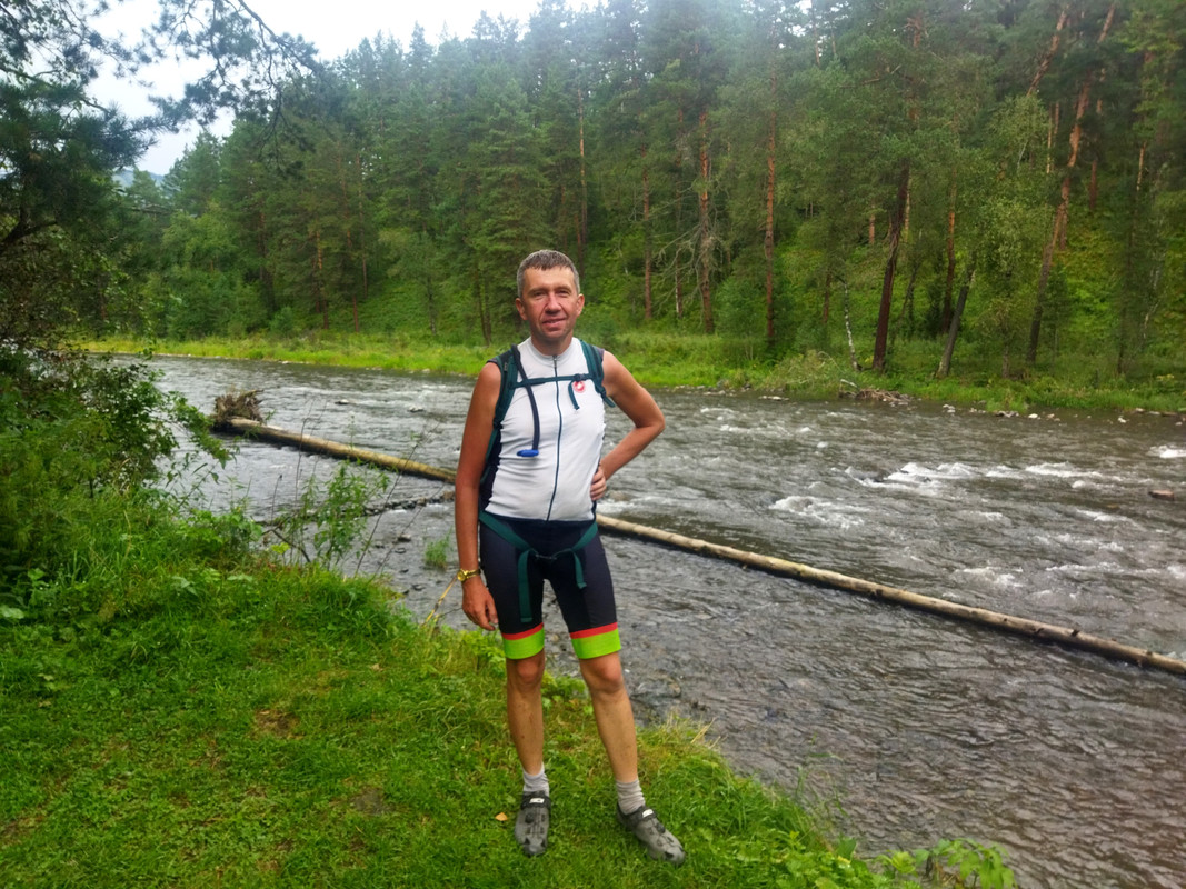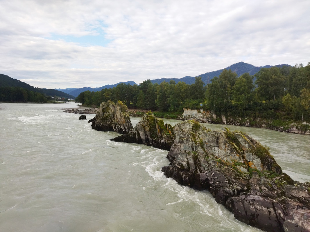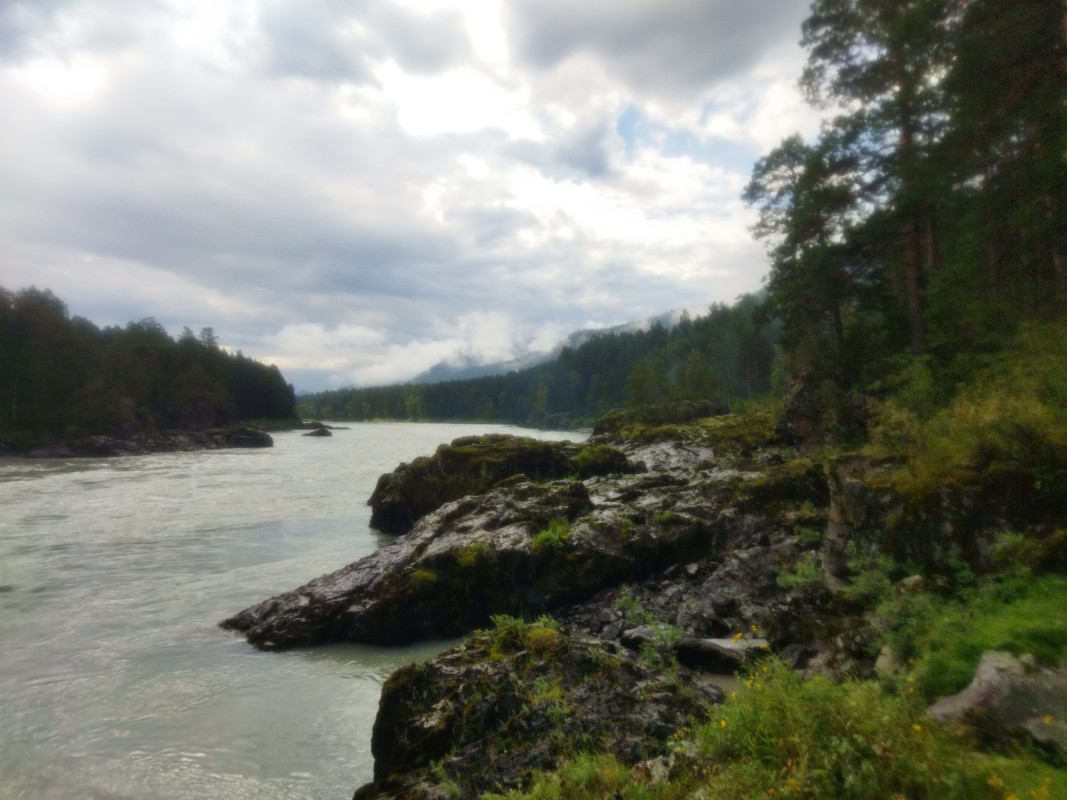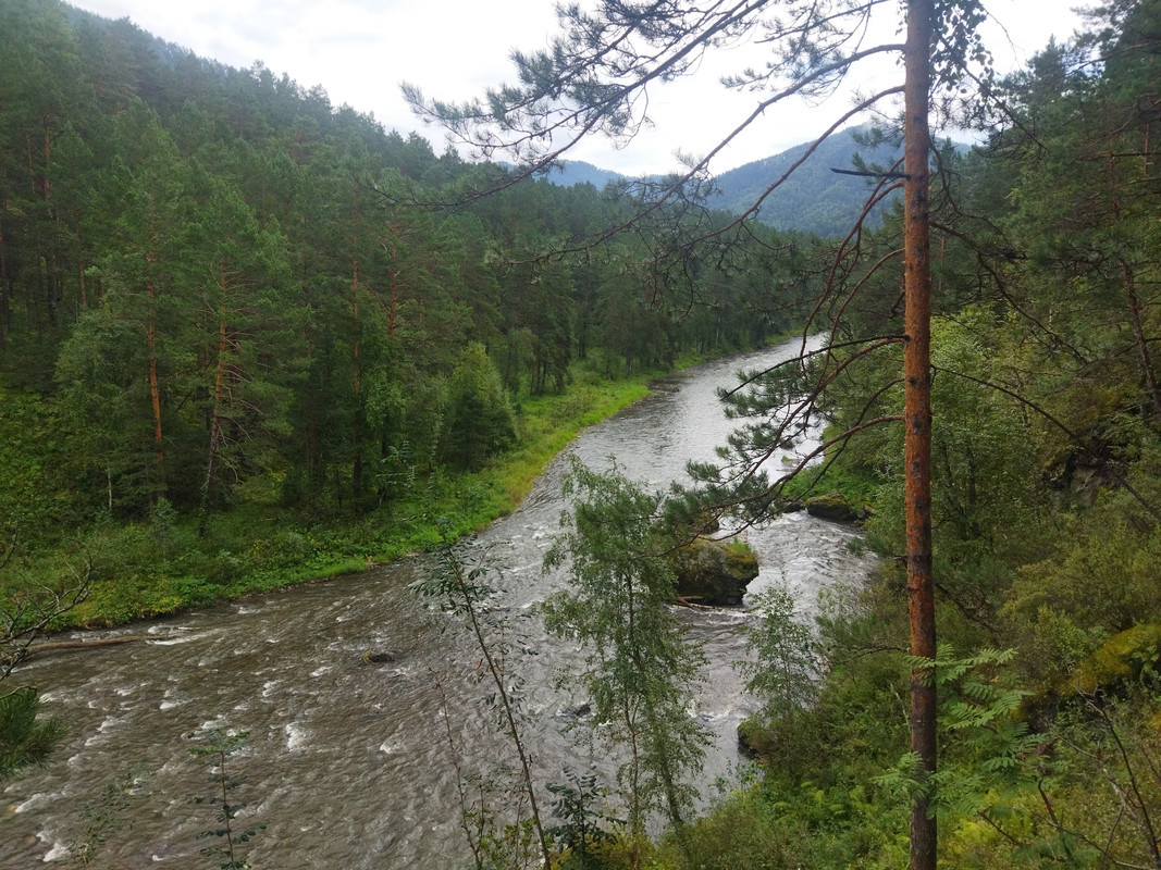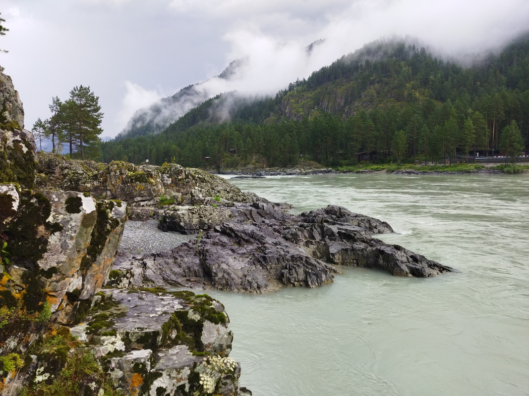 Перед Усть-Семой пошел уже серьезный дождь, и я вынужден был закутаться и зачехлиться. Потом я в последний раз пересек реку Катунь и поехал по тому берегу к Катуньским ваннам. Все вокруг в дожде и тумане.