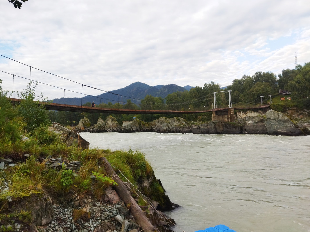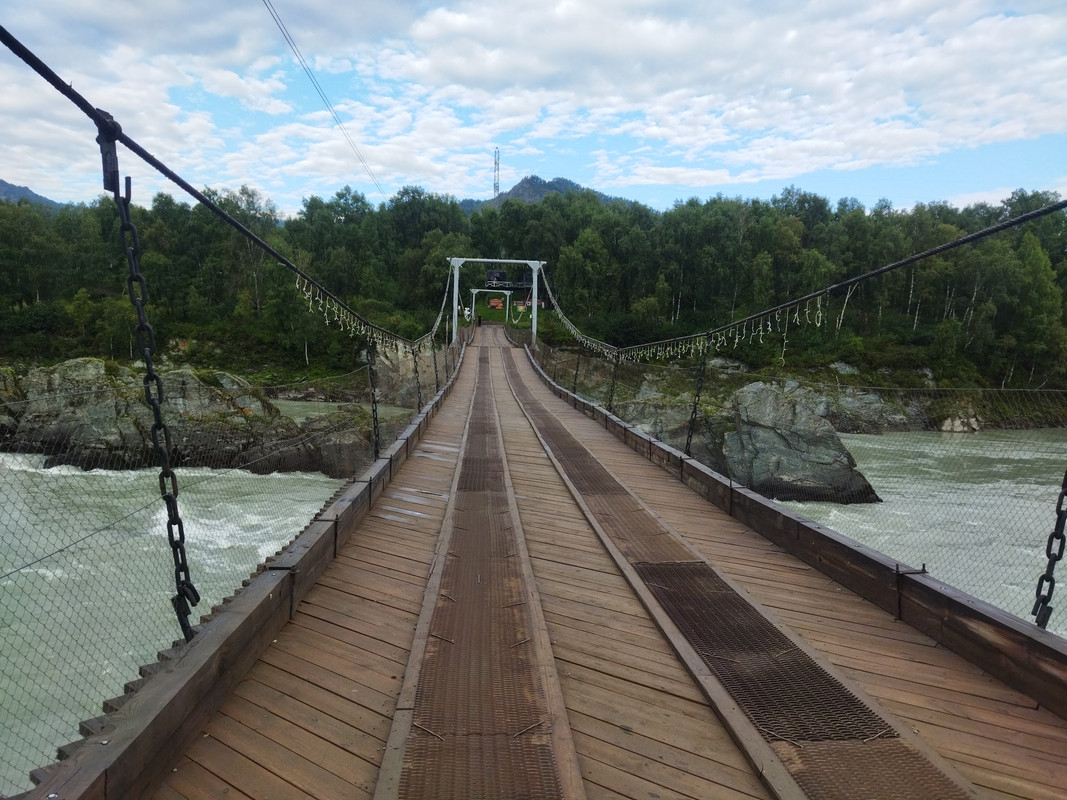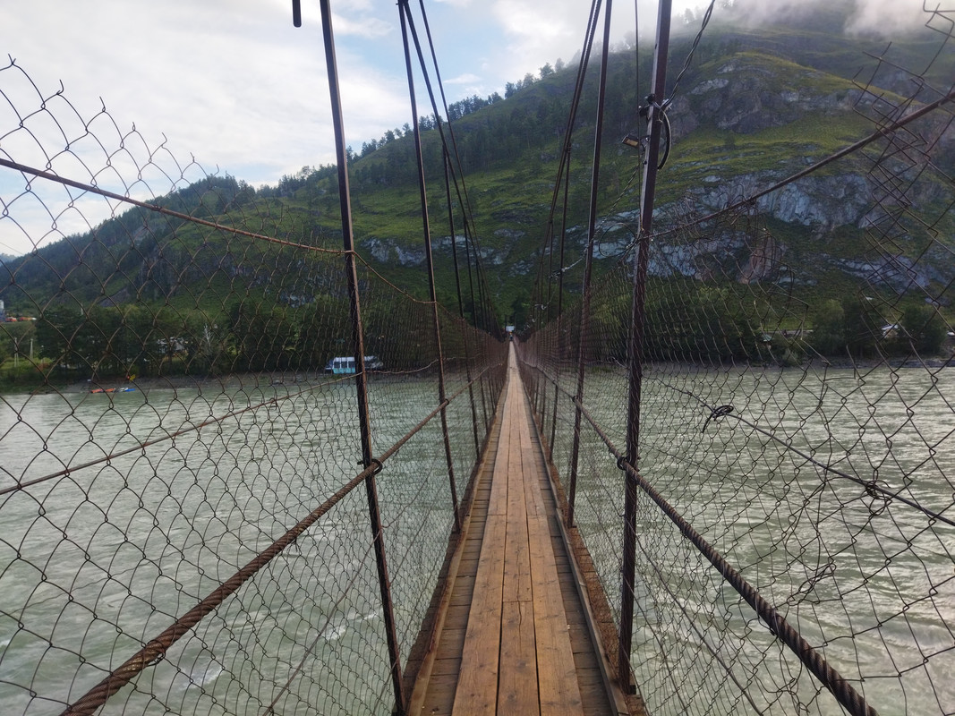 Потом я вернулся на Чемальский тракт и заехал еще на бензозаправку выпить кофе. Разговорился с местным водителем, который тоже фанат велосипеда и ездит на работу за 17 км. Сейчас мне надо было вернуться на Чуйский тракт тем же путем, но я решил частично проехать путь по другому берегу. В Элекмонаре я свернул на платный для водителей но бесплатный для велосипедистов мост. Он деревянный, подвесной.