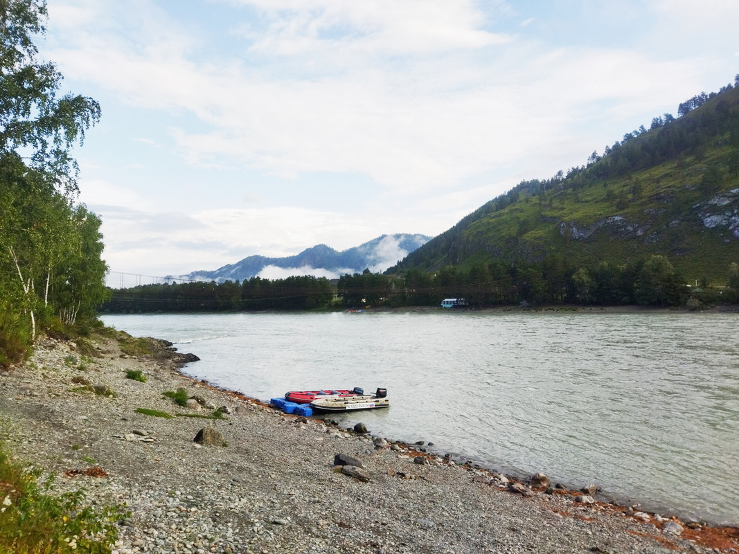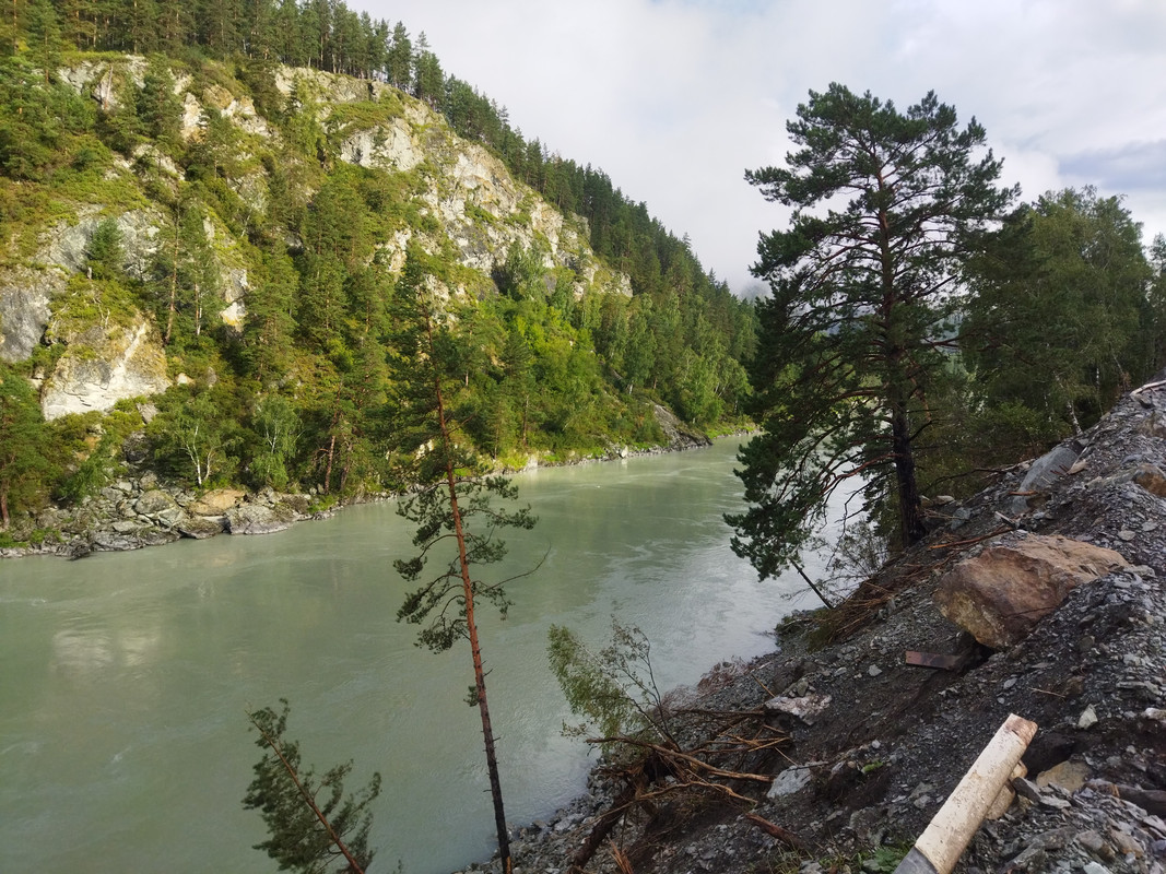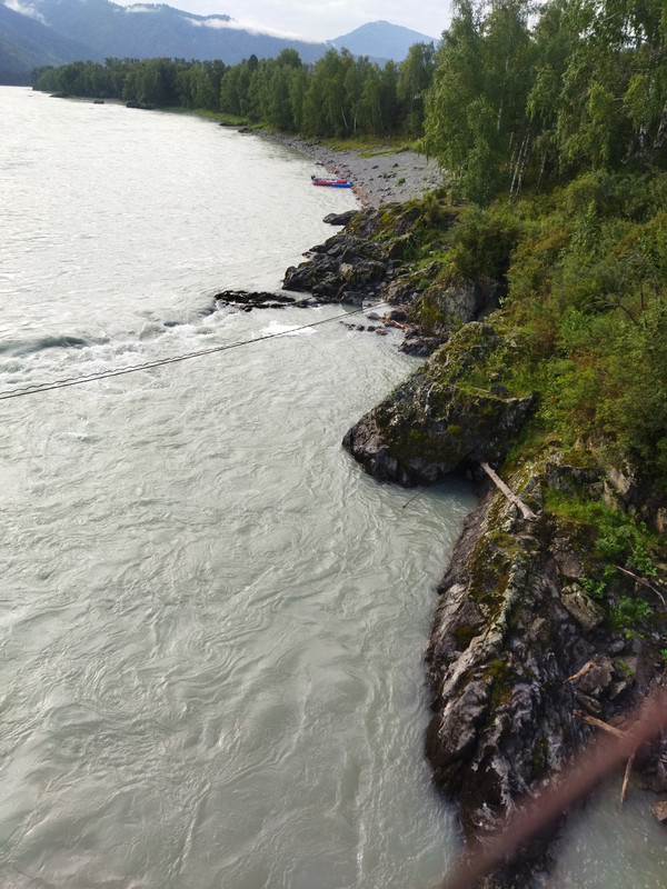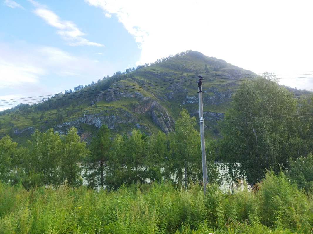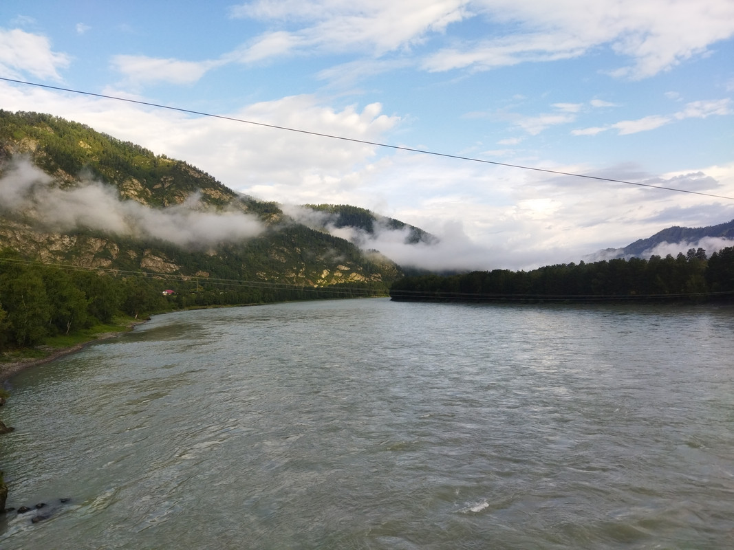 Одежда недосохла, поэтому я развешал ее где мог на раме и велоштанах. Дождя утром не было. Я объехал вчерашнюю гору вокруг и переехал реку Чемал через автомобильный мост.
