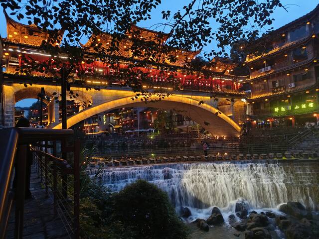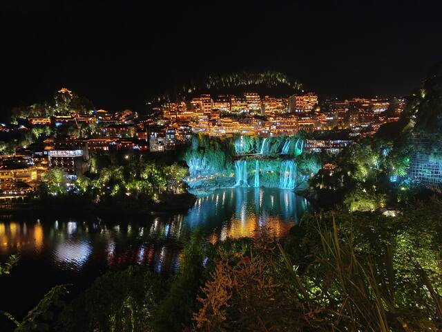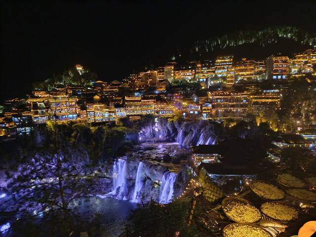 Теперь иду ко второй смотровой площадке и прохожу по билету. Весь город в разноцветных огнях. Эта площадка не одна, можно посмотреть с разных уровней. Цвет подсветки водопада меняется постоянно.