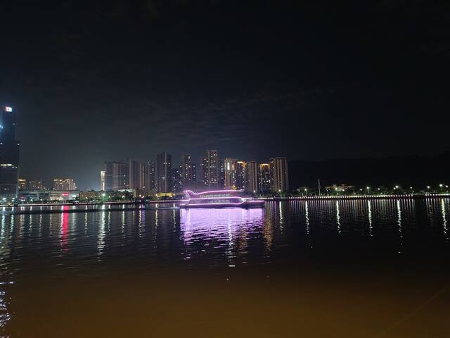 На фоне китайских жилых высоток плыл сияющий огнями прогулочный катер.