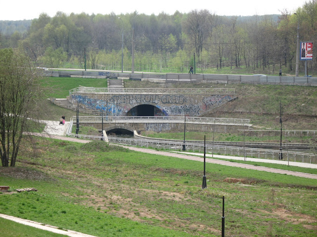 От пруда интересно пересечь Никулинскую улицу по пешеходному туннелю (ОСТОРОЖНО ! БИТОЕ СТЕЛО !). Въезд в него