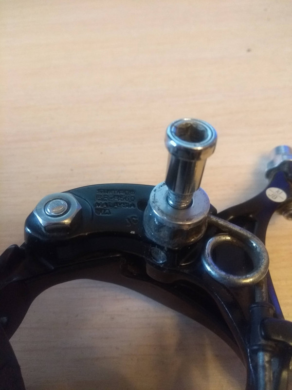 Тормоза уровня примерно Tiagra-105. Состояние хорошее, на переднем колодок ещё много, на заднем лучше поменять на новые. На переднем тормозе следы ржавчины на некоторых болтах. Вместо родных шайб 2 мм на ось крепления тормоза стоят обычные DINовские шайбы (они чуть меньше оригинальных по внешнему диаметру, если не нравятся, можно взять от любого старого тормоза). Рич вроде стандартный, 39-49 мм. Если нужно, есть более короткие гайки для переднего тормоза.