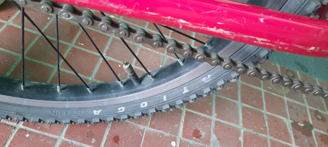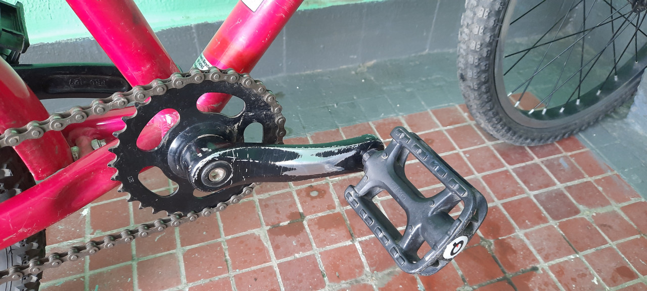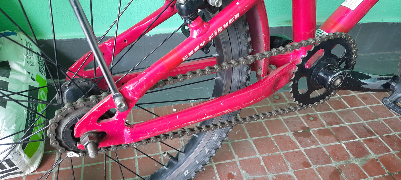 Рама, вилка и палки алюминиевые. Обвес стоковый, кроме грипс (стоят укороченные силиконовые ESI Chunky, сильно поюзанные, но по-прежнему приятные на ощупь) и педалей (половина левой стоковой педали отломилась, оставшиеся полторы педали могу отдать); ещё за годы эксплуатации продолбался кожух цепи. Обода одинарные, но никаких проблем с ними под детским весом не было. Шатуны 127 мм (ку-фактор, к сожалению, великоват, зазоры до нижних перьев по сантиметру), передача 32/18. Покрышки Tioga 20x1.75, с невысоким протектором. Вынос 60 мм под 25.4, руль райзер шириной 540 мм. Подседельный штырь 27.2.