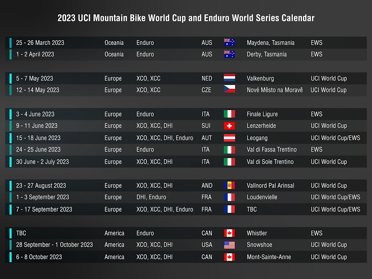 Календарь на 2023 год включает в себя как соревнования мировой эндуро серии EWS, так и Кубки мира по 15 гонок , охватывающих 34 старта в 10 странах и на 3 континентах.