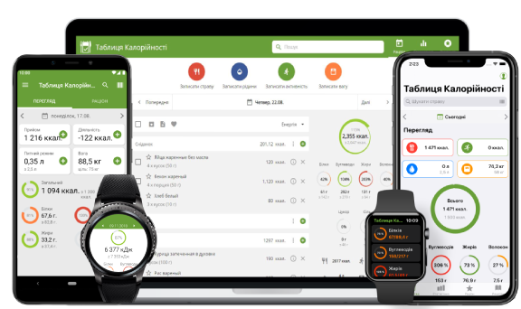 Калькулятор калорий который выводит суточную норму БЖУ и БД с позициями всех продуктов.