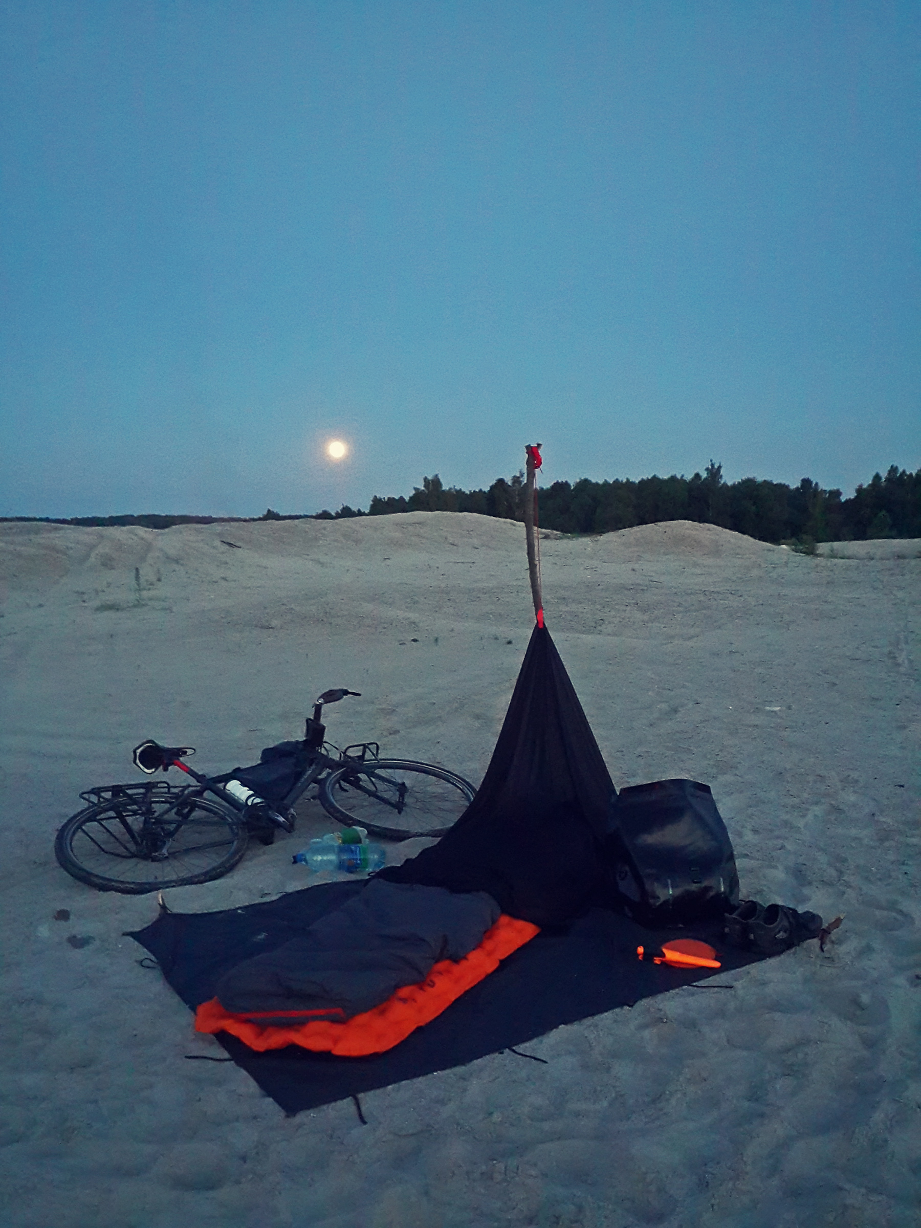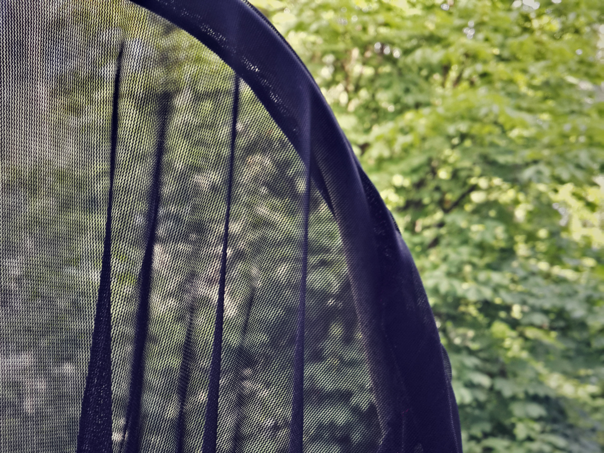 чисто експеремент. отлично дышится и в какой-то степени защита от солнца. там конструкция с карманом под коврик и резинкой-утяжкой, сетка не висит, а натянута пирамидой, закрывает и руки. сшил за полтора часа перед выездом. гуд