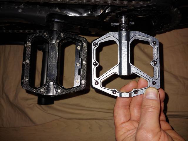 Опять таки не про Шредвану, но позитивчег. Не вижу педали которые бы хотелось купить. Хотелки: относительно тонкие, не как старые сейнты, вес до 350 грамм, не сильно здоровые. НТ вроде есть пара моделек но просят за них не стесняясь. На удивление выцепил с ибея эти шедевры ценой в три гамбургера. 308 грамм, профиль достаточно тонкий, центральный канал у шатуна ниже шипов, нога норм стоит на них. Шипод достаточно. Пока только один выкат, но впечатления приятные. Дизайн намекает что там мелкий подш и бушинг, но честно говоря пох за эти деньги. Нт ае3 с виду такого же дизайна но весят больше и стоят в 5 раз дороже.
