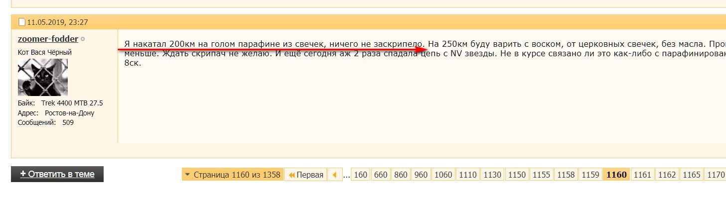 Не обращай внимания, он заскринил древний мой пост, когда я только пришёл в тему, естественно я начал с парафина убогово и беспонтового, ибо воск с маслом было лень, а когда я таки собаку съел - никогда не буду использовать парафин, он вообще ни в какое сравнение с воском не идёт, ибо шлак в цепи высыпающийся быстрее, чем загрязнится голое масло.