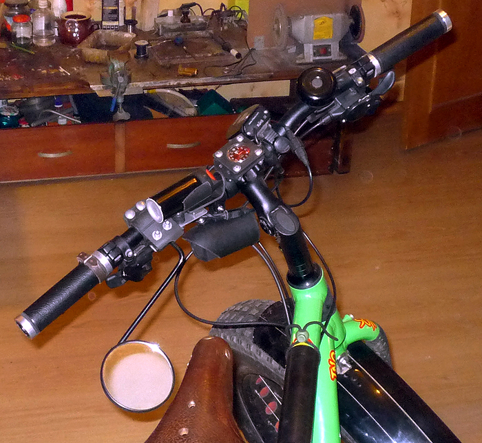 (К сожалению полупрофи-Кенон в тесном пространстве при своем штатном полтиннике не берет все в кадр, потому пришлось воспользоваться мыльницей). Буквально на днях провел оптимизацию всего, что мне удобно держать на раме и руле, снизив массу и увеличив компактность расположения, а до того выглядел так.