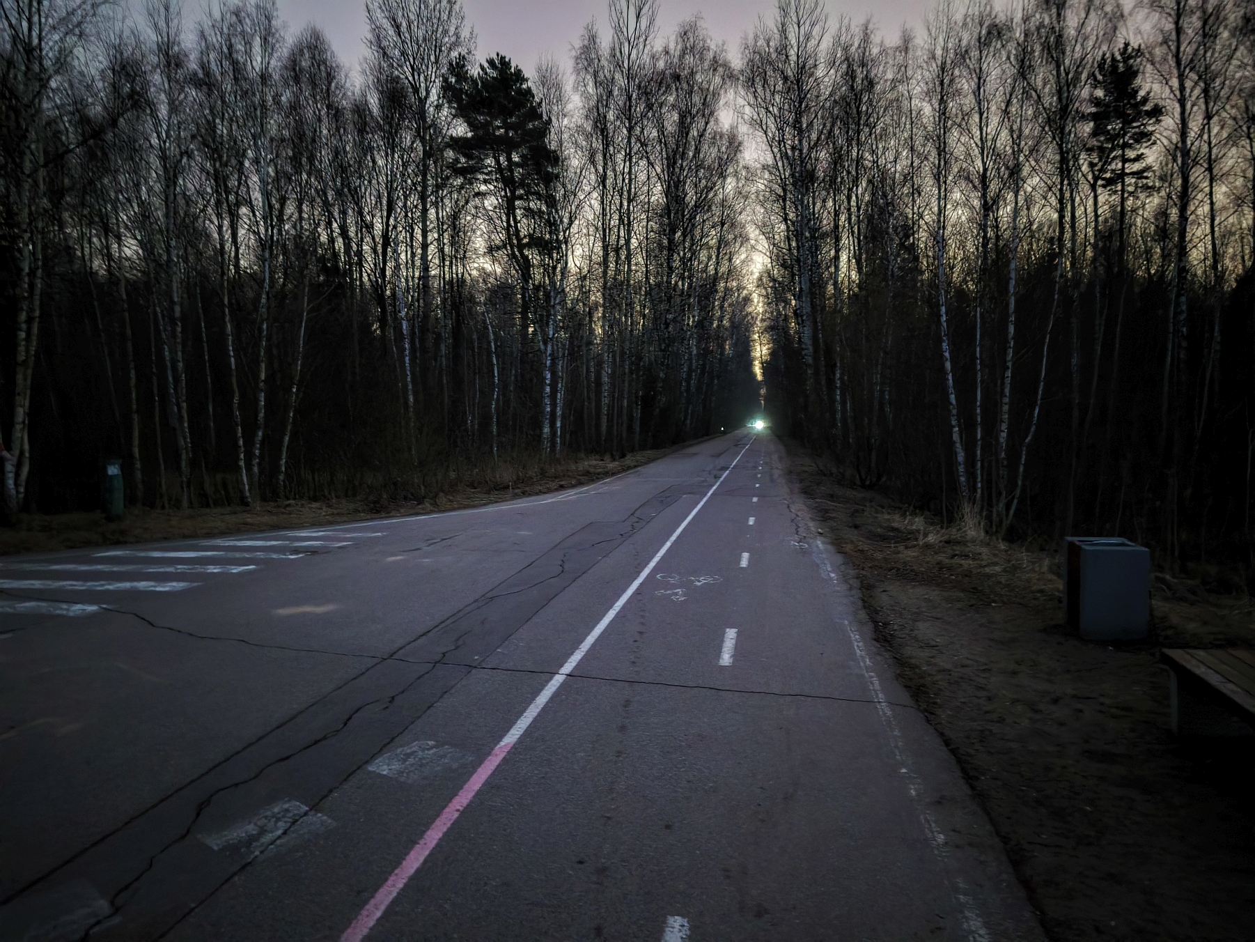 На асфальтовых просеках после зимы асфальт местами разбитый, трещины в асфальте значительные. На шоссейной резине в некоторых местах можно убраться. На широкой резине будет норм.