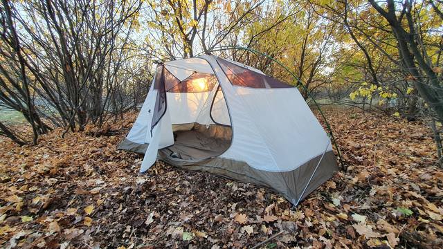 Утром было свежо, -4 градуса. Начал было дубеть, но потом затянул оба спальника, оставив совсем небольшое отверстие для дыхания. Тут же согрелся. Конденсат на палатке замёрз нафиг, так даже проще было, стряхнул сколько стряхнулось и засунул в чехол.