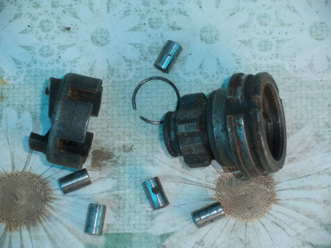 На изготовленной втулке были использованы как советские ,так и китайские звездочки и в результате эксплуатации срезания трех зацепов на звездочке не было.В связи с тем,что точность изготовления деталей невысокая, необходимо устранить люфт в сопряжении шлицов пятерика и зацепов звездочки.Для этого в зазоры вставлены шпонки изготовленные из расплющенной по толщине зазоров спицы,длина шпонок 3мм.От выпадания шпонки зафиксированы стопорным кольцом звезды.![]()