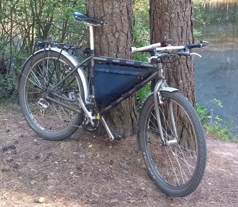 Четвёртый год почти ежедневного комьютинга (кроме зимы - для неё собран алюминиевый ригид с дисками). Всё живо-здорово, только кантики поменял на Avid Shorty (показались проще в настройке) и задний переклюк на этот сезон заменил на Shimano DX (RD-M650): стоявший до этого XTR надо бы обслужить, да и ролики на нём убивать в ноль жалко. Возможно, в следующем сезоне и комборучки XTR отправлю на отдых, заменю на Shimano LX, которые давно лежат в запасе.