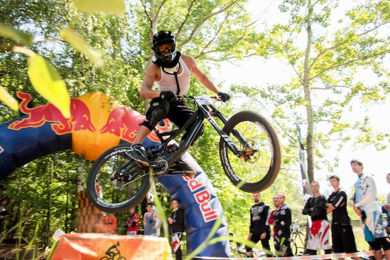 Да, тут же в начале сентября прошёл первый в России этап гонок в закрытых помещениях - DownMall Russia в ТРЦ "СпортЕХ". Мне повезло попасть в число 55 приглашённых гонщиков, но перед заездами меня настиг лютый фейл - недолетев на тренировке дроп со второго этажа на первый, я сел кареткой на "перегиб" приземления, и от этого удара карбоновый (!) успок начисто срезал три (!!) титановых (!!!) болта, коими он был прикреплён к раме. Оставшись без успока, принять участие в гонке я уже не смог, ибо цепь слетала после первых же лестничных пролётов, а специфика трассы в торговом центре предполагала отчаянное крутилово на любом пригодном для этого месте. Дико обидно даже спустя месяц