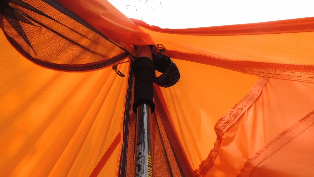 whiskas235, стойка у меня упирается в месте схождения. Там ткань поплотнее. Стойку оставил как есть. Стоить достаточно устойчиво в наклоном положении. Думал с одно края отрезать, но не стал. Не мешает в общем. В степи когда ночевал был ветер с сильными порывами и палатка устойчиво стояла. Колышки родные поменял на широкие титановые, устойчивее в грунте держат, хоть тяжелее будут.