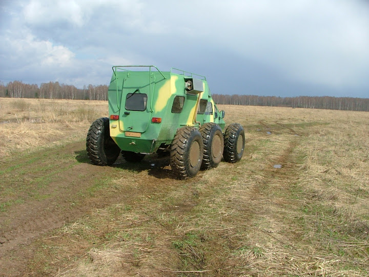 Поле у Аржаников пересечено сетью колей разной глубины, везде много воды, похоже на тундру летом. Нас догоняет чюдо-дивайс, вездеход на 6-ти колесах. Идет бесшумно, как плывет.