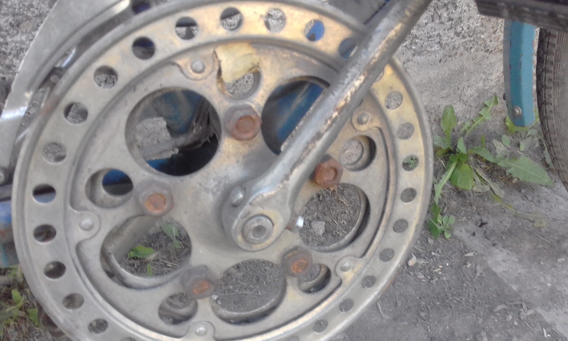 В дополнение к штатной звездочке прикручена типа "понижающая" передача. Шлифовал обычную звездочку до толщины цепи. Прикручивал болтами НА ДЕСЯТЬ! А там просто были отверстия такого диаметра на обоих звездах. Граммы, говорите, экономить надо? Бхах!