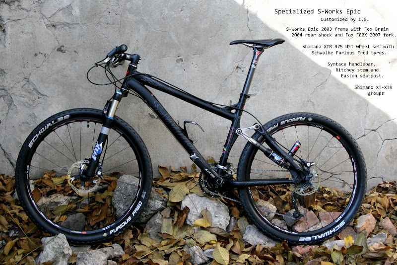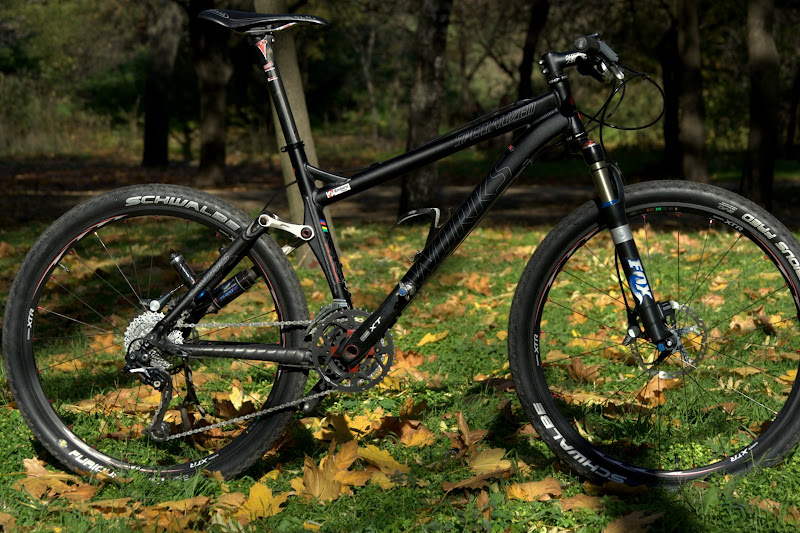 В конечном счете это стали в основе алюминиевой рамы - вилка Fox c терралоджиком, которая работает в купе с задним амортизатором Fox с брейном как единое целое. Соотношение ходов подвесок 80/90мм. Карбоновые палки выбирались по критерию их безпроблемности, жесткости и веса - альтернатив тут было совсем немного. Трансмиссия изначально была Shimano XT 760, сейчас по мере всяких фактов и случайностей (да-да) она постепенно заменяется на XTR, разве что система будет скорее всего иной, но это уже планы не этого года. С разными колесами немного пробовал, дабы найти для себя оптимальное решение, включая как фабричные вилсеты, так и сборные колеса. Остановился на исключительном для меня безкамерном вилсете XTR. Масса велосипеда в сборе - 11020 (+/- 20) грамм, взвешенно на электронном безмене.