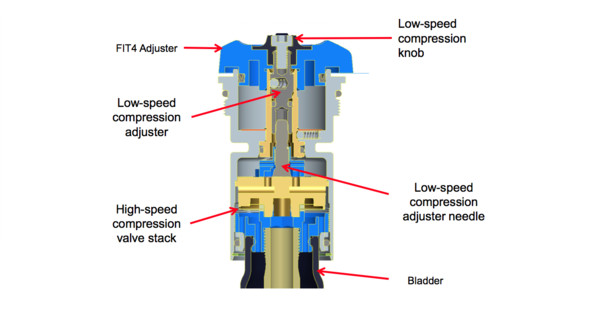 - Топовый Fit4 демпфер, полностью изолирован от масла в ноге(в отличии от GRIP-серии), имеет три основных положения работы "Open-Medium-Firm" + дополнительная крутилка низкоскоростной компрессии + регулировка отскока