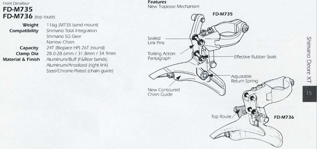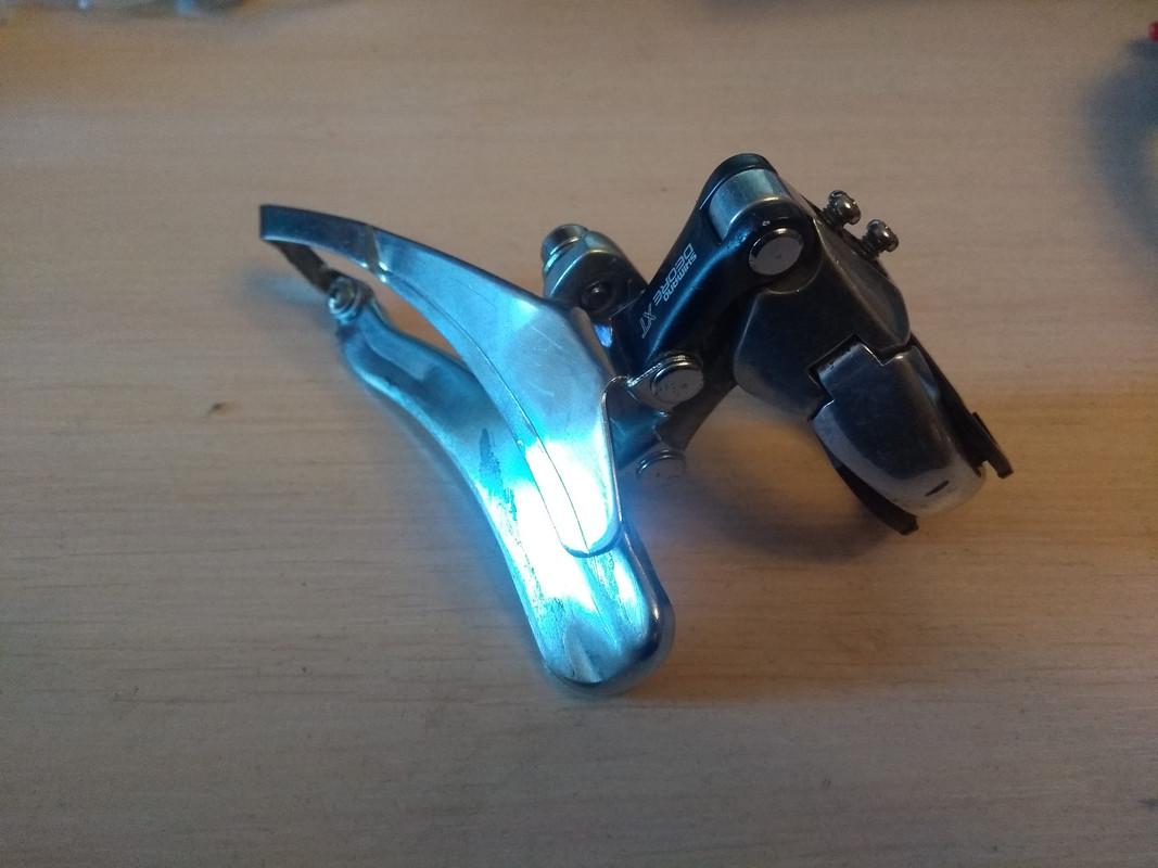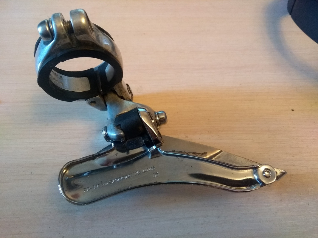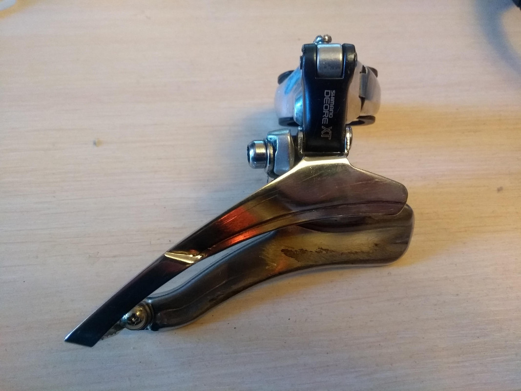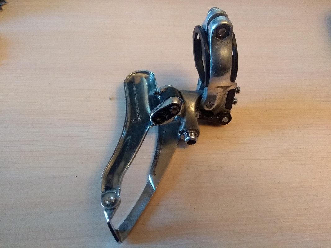 Олдскульный переключатель из начала 90-х годов, должен хорошо работать со звёздами 46-48 зубов и с широкими цепями на 7-8 скоростей. Верхний хомут на трубу 34.9 (в комплекте переходник на 31.8), верхняя тяга. Есть потёртости на рамки и небольшие люфты в механизме, в целом состояние рабочее.