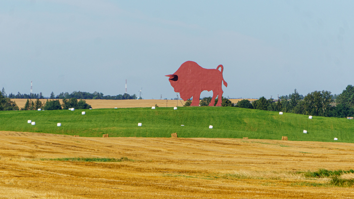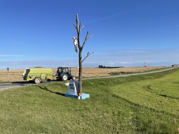 Отдохнул хорошо, позавтракал овсянкой и часов в 7 выехал. Трафик сильно уменьшился, стало немного прохладнее. С утра катилось веселее ). На границе Минской и Гродненской областей стоит огромный металлический зубр. На пустой и скучной трассе это одно из редких мест, где можно остановиться, размяться и пофотографироваться )