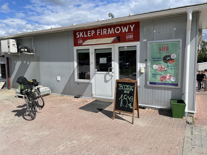 За городом уже пошла великолепная велодорожка вдоль скоростной автомагистрали. Ехать очень здорово, но немного шумновато. По пути заехал в магазин при местной небольшой мясной фабрике. Купил себе колбасы к ужину. В Польше продукты весьма вкусные, недорогие и хорошего качества.