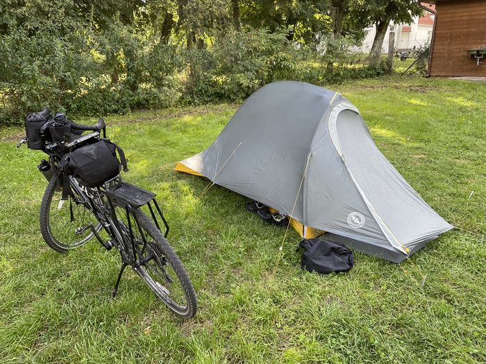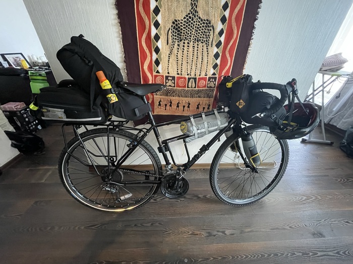 Про велосипед: велосипед для путешествий (FUJI Touring) я купил пару лет назад. Потом занимался закупкой для него всякого туристического обвеса. Велосумку-штаны я возить с собой не захотел, решил сделать байкпакинговый вариант- сумка на руль, сумка-колчан под седло, байпакинговая палатка, сумка на багажник для документов, фото, всякой мелочевки, пара сумок-кормушек, сумочка для инструмента и ремкомплекта, насос и пара-тройка бутылок для воды. Первый поход был по Алтаю в 800 км. Для этого похода я добавил на багажник сумку на салазках, чтобы можно было быстро её снимать для вылазки в магазин, например. В ней хранились документы и деньги. Купил замок U-lock (уж очень я опасался воровства велосипедов в Европе). Велосипед стал выглядеть так: